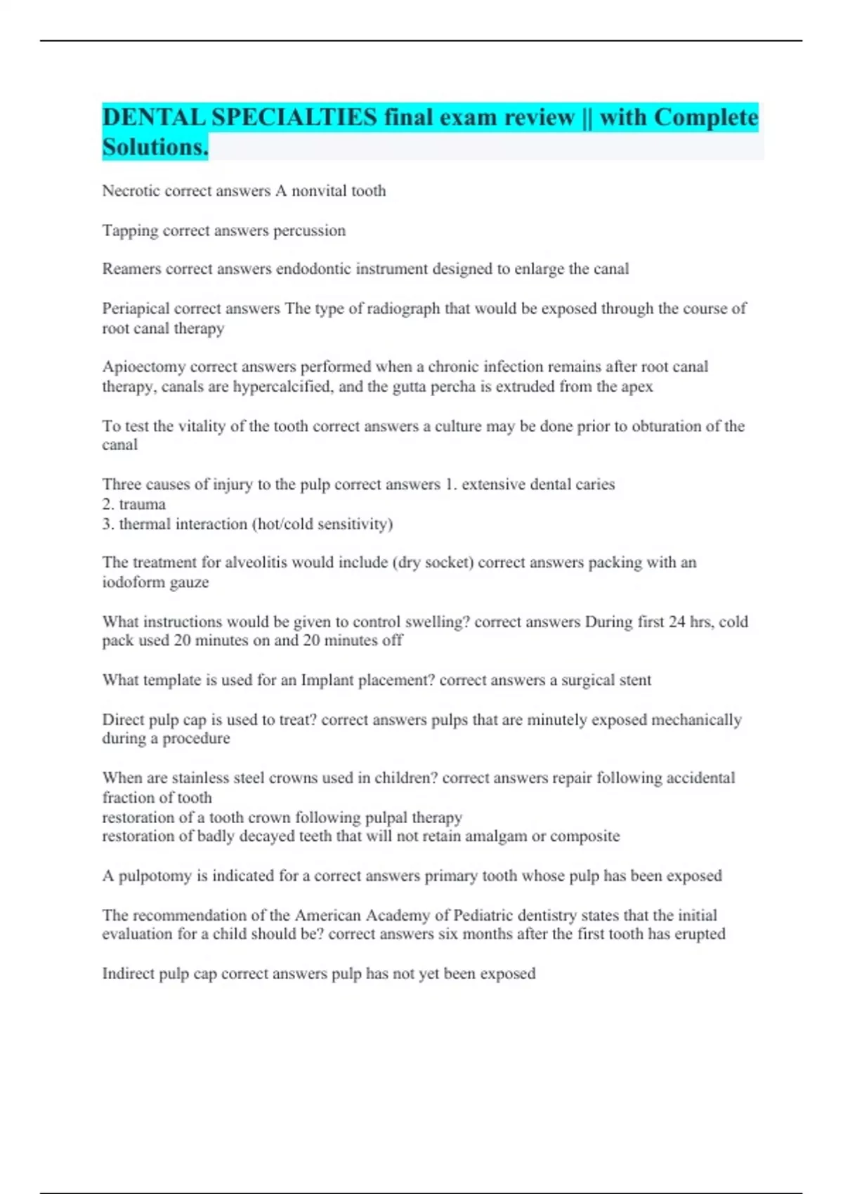 DENTAL SPECIALTIES final exam review || with Complete Solutions.