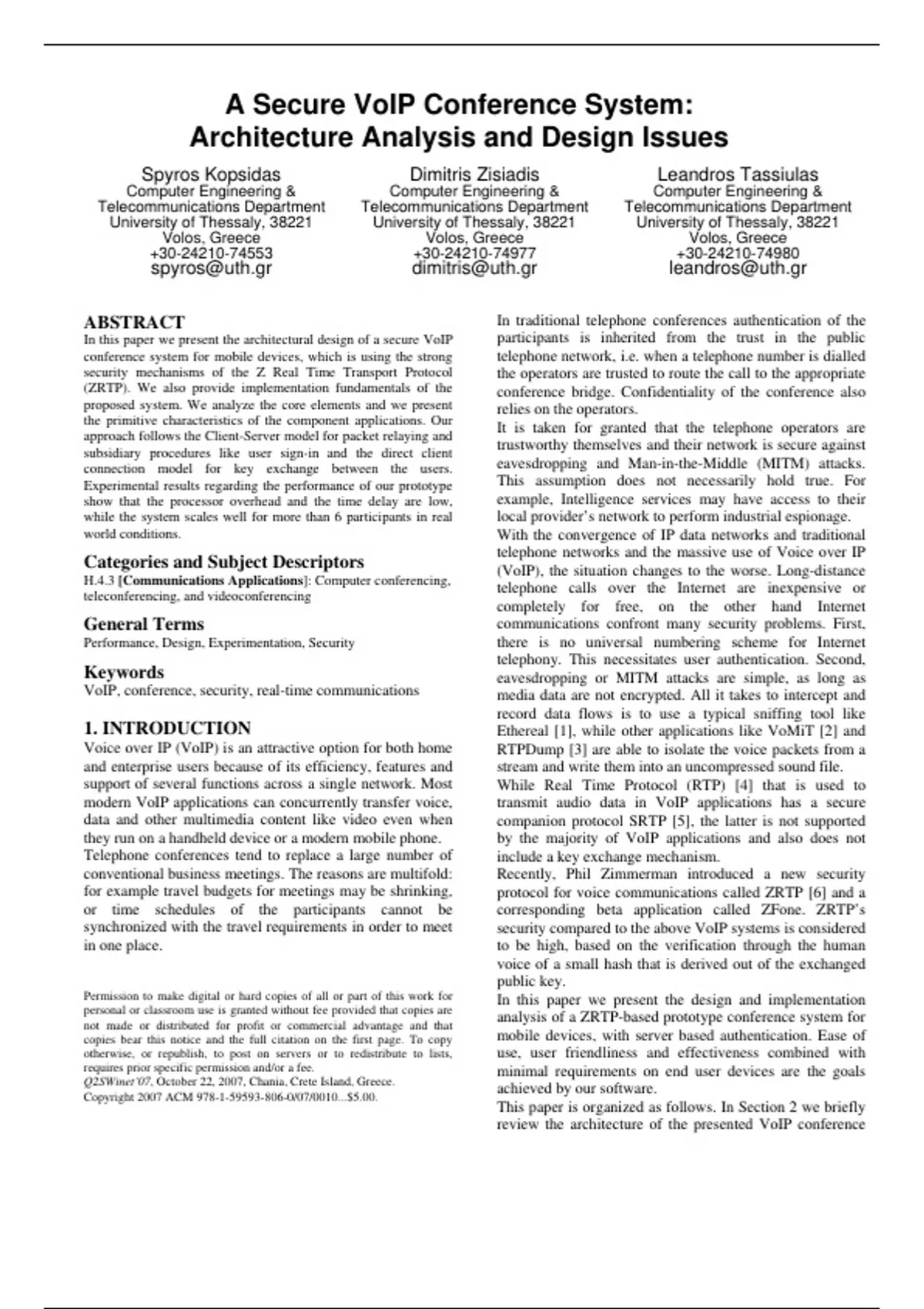 A Secure VoIP Conference System: Architecture Analysis and Design Issues Spyros Kopsidas Computer Engineering & Telecommunications Department University of Thessaly, 38221 Volos, Greece Dimitris Zisiadis Computer Engineering & Telecommunications Department University of Thessaly, 38221 Volos, Greece Leandros Tassiulas Computer Engineering & Telecommunications Department University of Thessaly, 38221 Volos, Greece ABSTRACT In this paper we present the architectural design of a secure VoIP conference system for mobile devices, which is using the strong security mechanisms of the Z Real Time Transport Protocol (ZRTP). We also provide implementation fundamentals of the proposed system. We analyze the core elements and we present the primitive characteristics of the component applications. Our approach follows the Client-Server model for packet relaying and subsidiary procedures like user sign-in and the direct client connection model for key exchange between the users. Experimental results regarding the performance of our prototype show that the processor overhead and the time delay are low, while the system scales well for more than 6 participants in real world conditions. Categories and Subject Descriptors H.4.3 [Communications Applications]: Computer conferencing, teleconferencing, and videoconferencing General Terms Performance, Design, Experimentation, Security Keywords VoIP, conference, security, real-time communications 1. INTRODUCTION Voice over IP (VoIP) is an attractive option for both home and enterprise users because of its efficiency, features and support of several functions across a single network. Most modern VoIP applications can concurrently transfer voice, data and other multimedia content like video even when they run on a handheld device or a modern mobile phone. Telephone conferences tend to replace a large number of conventional business meetings. The reasons are multifold: for example travel budgets for meetings may be shrinking, or time schedules of the participants cannot be synchronized with the travel requirements in order to meet in one place. Permission to make digital or hard copies of all or part of this work for personal or classroom use is granted without fee provided that copies are not made or distributed for profit or commercial advantage and that copies bear this notice and the full citation on the first page. To copy otherwise, or republish, to post on servers or to redistribute to lists, requires prior specific permission and/or a fee. Q2SWinet’07, October 22, 2007, Chania, Crete Island, Greece. Copyright 2007 ACM 978-1-59593-806-0/07/0010...$5.00. In traditional telephone conferences authentication of the participants is inherited from the trust in the public telephone network, i.e. when a telephone number is dialled the operators are trusted to route the call to the appropriate conference bridge. Confidentiality of the conference also relies on the operators. It is taken for granted that the telephone operators are trustworthy themselves and their network is secure against eavesdropping and Man-in-the-Middle (MITM) attacks. This assumption does not necessarily hold true. For example, Intelligence services may have access to their local provider’s network to perform industrial espionage. With the convergence of IP data networks and traditional telephone networks and the massive use of Voice over IP (VoIP), the situation changes to the worse. Long-distance telephone calls over the Internet are inexpensive or completely for free, on the other hand Internet communications confront many security problems. First, there is no universal numbering scheme for Internet telephony. This necessitates user authentication. Second, eavesdropping or MITM attacks are simple, as long as media data are not encrypted. All it takes to intercept and record data flows is to use a typical sniffing tool like Ethereal [1], while other applications like VoMiT [2] and RTPDump [3] are able to isolate the voice packets from a stream and write them into an uncompressed sound file. While Real Time Protocol (RTP) [4] that is used to transmit audio data in VoIP applications has a secure companion protocol SRTP [5], the latter is not supported by the majority of VoIP applications and also does not include a key exchange mechanism. Recently, Phil Zimmerman introduced a new security protocol for voice communications called ZRTP [6] and a corresponding beta application called ZFone. ZRTP’s security compared to the above VoIP systems is considered to be high, based on the verification through the human voice of a small hash that is derived out of the exchanged public key. In this paper we present the design and implementation analysis of a ZRTP-based prototype conference system for mobile devices, with server based authentication. Ease of use, user friendliness and effectiveness combined with minimal requirements on end user devices are the goals achieved by our software. This paper is organized as follows. In Section 2 we briefly review the architecture of the presented VoIP conference system and its security elements. In Section 3 we introduce our prototype implementation analysis. Application performance measurements regarding delay overheads on a user terminal are provided in Section 4. Finally, in Section 5 we summarize and comment on potential directions of future work. 2. SYSTEM ARCHITECTURE Besides being PKI independent, ZRTP has another revolutionary feature: its key exchange procedure is performed over RTP. This approach allows users to form a private closed user group with encrypted conversation, where the VoIP service provider is offering only the supporting conference centre facilities. Initially, ZRTP uses ephemeral Diffie-Hellman as its key exchange algorithm. After a successful handshake process, the RTP packet streams are encrypted as SRTP. In our design, each user is registered to the server via a unique {Username, Symmetric Key} pair. The Symmetric Key itself is 96b