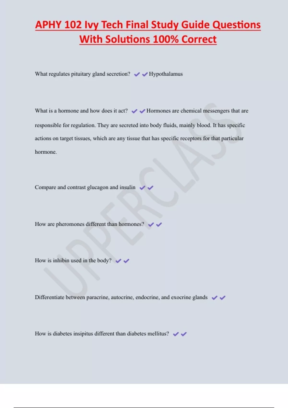 APHY 102 Ivy Tech Final Study Guide Questions With Solutions 100% Correct What regulates pituitary gland secretion? Hypothalamus What is a hormone and how does it act? Hormones are chemical messengers that are responsible for regulation. They are secreted into body fluids, mainly blood. It has specific actions on target tissues, which are any tissue that has specific receptors for that particular hormone. Compare and contrast glucagon and insulin How are pheromones different than hormones?