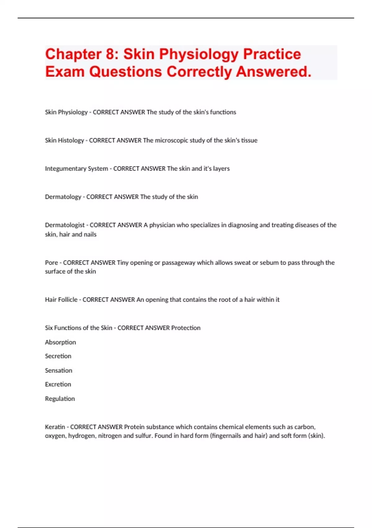 Chapter 8: Skin Physiology Practice Exam Questions Correctly Answered. Skin Physiology - CORRECT ANSWER The study of the skin's functions Skin Histology - CORRECT ANSWER The microscopic study of the skin's tissue Integumentary System - CORRECT ANSWER The skin and it's layers Dermatology - CORRECT ANSWER The study of the skin Dermatologist - CORRECT ANSWER A physician who specializes in diagnosing and treating diseases of the skin, hair and nails Pore - CORRECT ANSWER Tiny opening or passageway which allows sweat or sebum to pass through the surface of the skin Hair Follicle - CORRECT ANSWER An opening that contains the root of a hair within it Six Functions of the Skin - CORRECT ANSWER Protection Absorption Secretion Sensation Excretion Regulation Keratin - CORRECT ANSWER Protein substance which contains chemical elements such as carbon, oxygen, hydrogen, nitrogen and sulfur. Found in hard form (fingernails and hair) and soft form (skin).