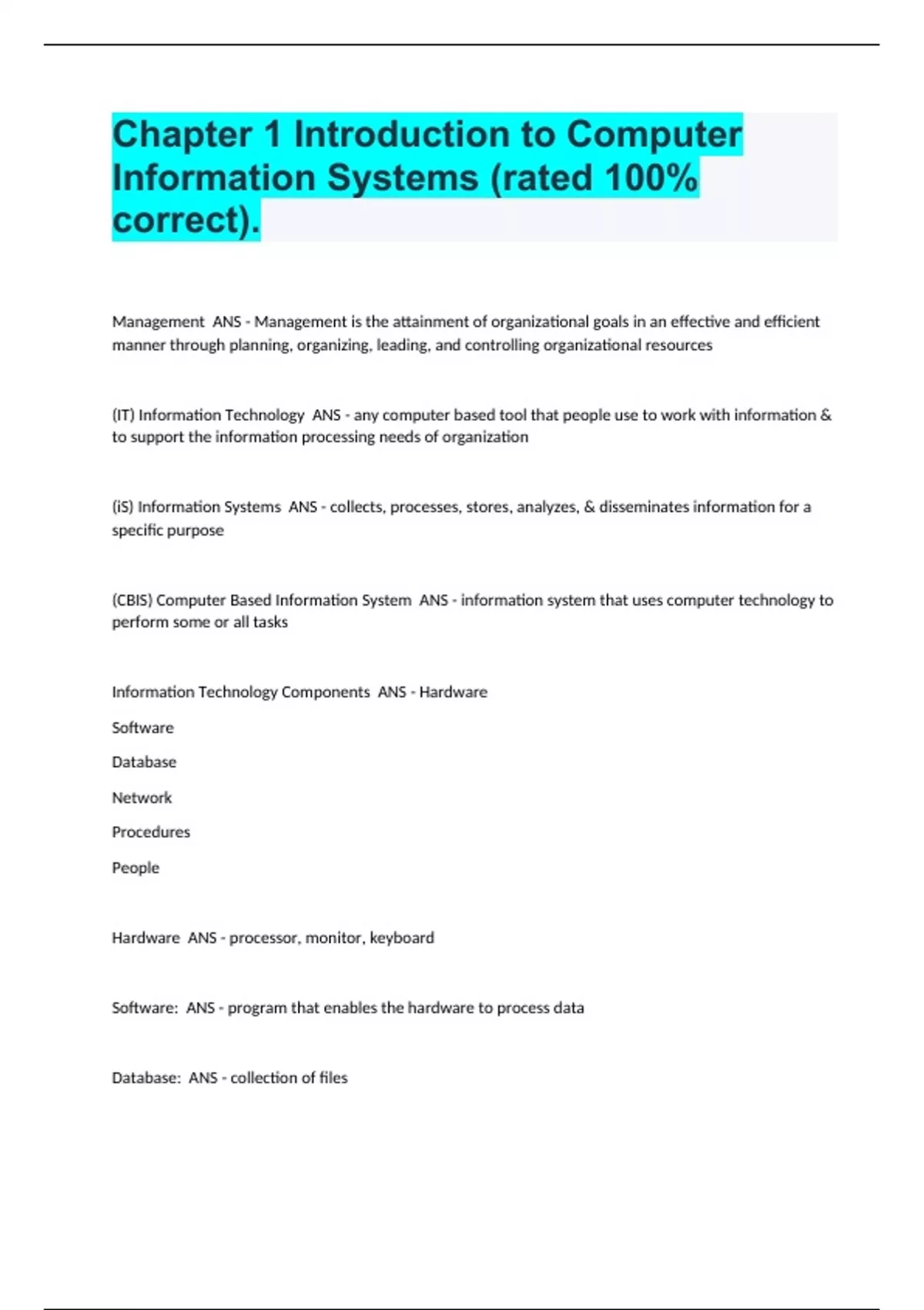 Chapter 1 Introduction to Computer Information Systems (rated 100% correct).