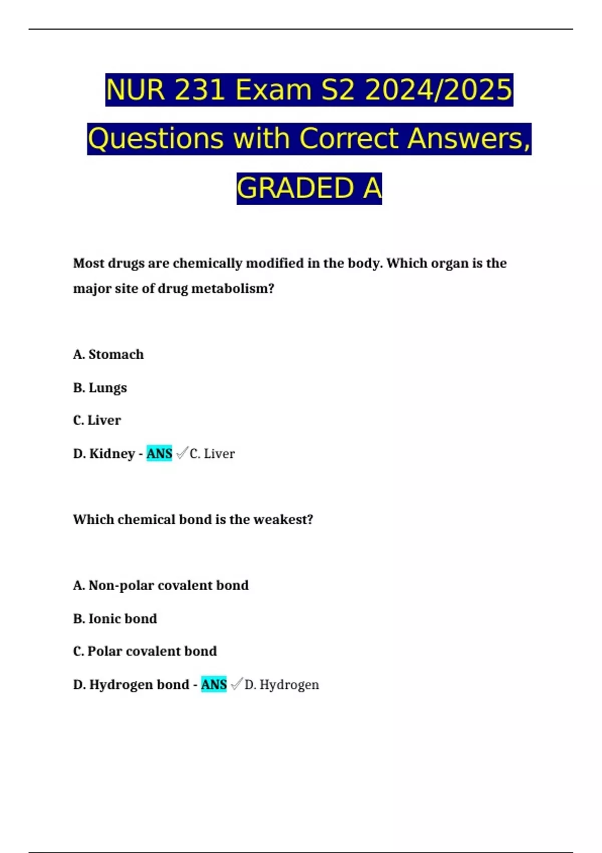 NUR 231 Exam S2 2024/2025 Questions with Correct Answers, GRADED A