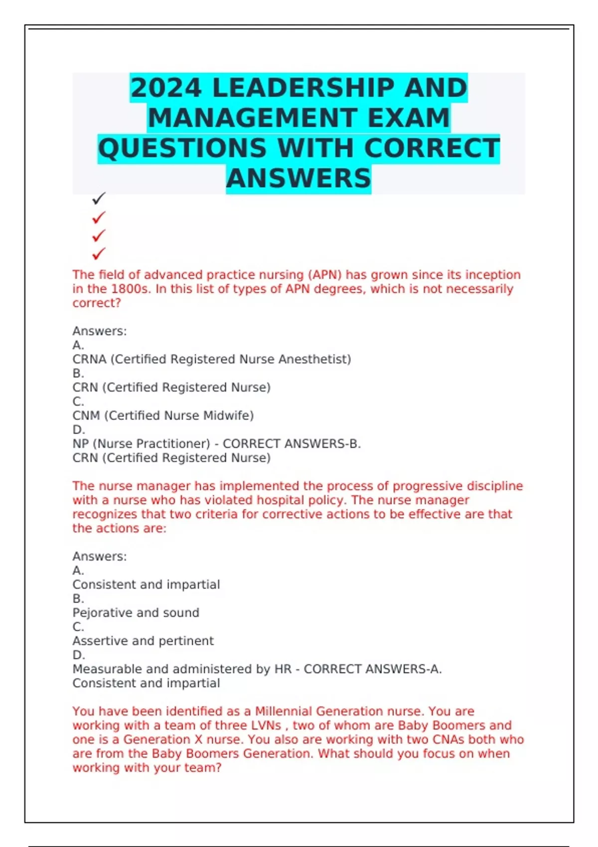 D. Providing the LVNs with additional responsibilities and have then supervise the CNAs in what ever manner they choose - CORRECT ANSWERS-A.