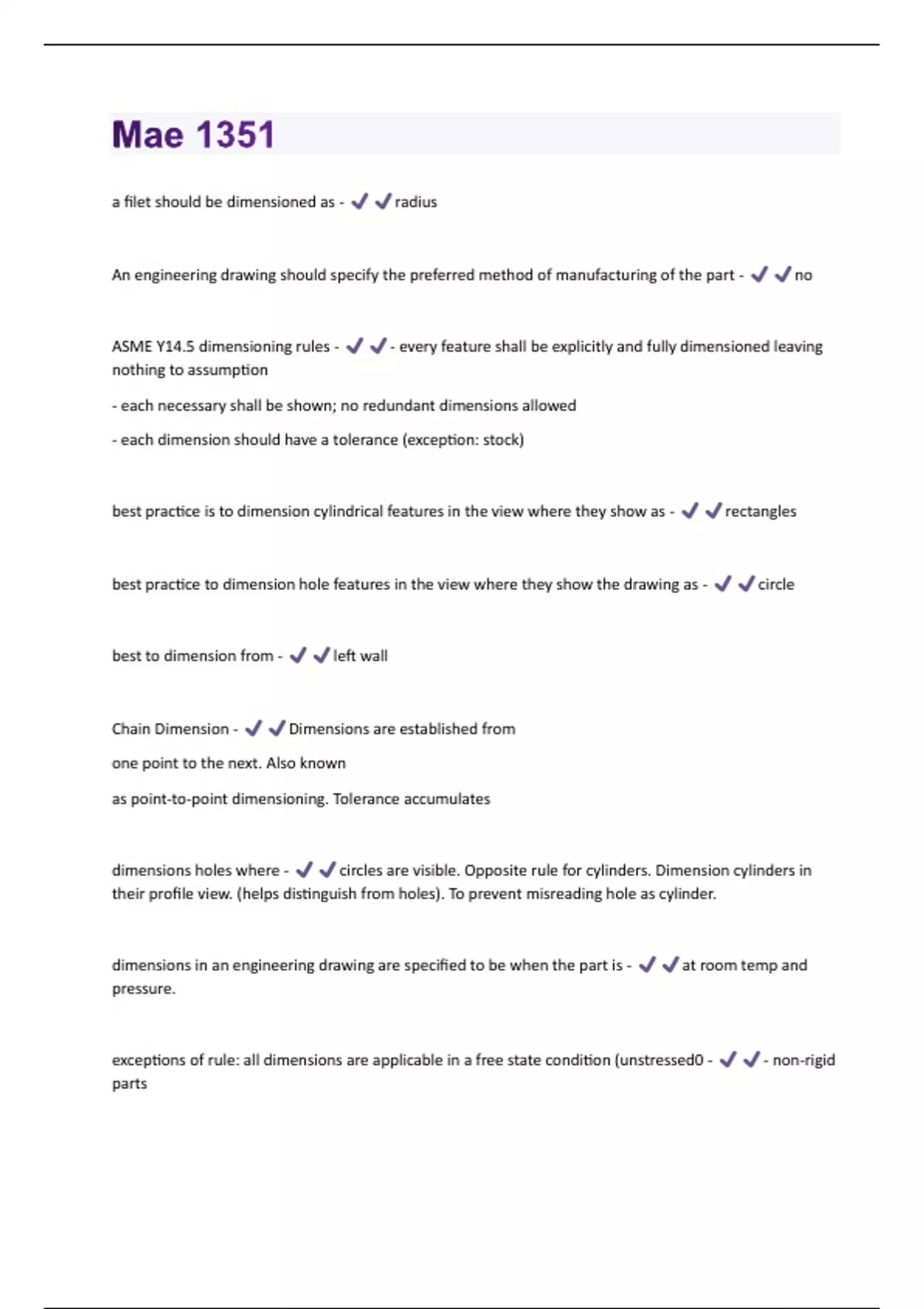 a filet should be dimensioned as - radius An engineering drawing should specify the preferred method of manufacturing of the part - no ASME Y14.5 dimensioning rules - - every feature shall be explicitly and fully dimensioned leaving nothing to assumption - each necessary shall be shown; no redundant dimensions allowed - each dimension should have a tolerance (exception: stock) best practice is to dimension cylindrical features in the view where they show as - rectangles best practice to dimension hole features in the view where they show the drawing as - circle best to dimension from - left wall Chain Dimension - Dimensions are established from one point to the next. Also known as point-to-point dimensioning. Tolerance accumulates dimensions holes where - circles are visible. Opposite rule for cylinders. Dimension cylinders in their profile view. (helps distinguish from holes). To prevent misreading hole as cylinder. dimensions in an engineering drawing are specified to be when the part is - at room temp and pressure. exceptions of rule: all dimensions are applicable in a free state condition (unstressed0 - - non-rigid parts- parts that must be restrained for inspection (drawing must specify how) holes - - dimension as circles - hole call out (click on annotations) horizontal dimension - relative to right edge if a feature is very important, it is good to show its dimensions In multiple views. - no in engineering drawing, every dimension requires tolerancing - yes instead of specifying the manufacturing method - specify the the desired final dimensions and final geometry instead its ok to dimension hidden lines - no bad partial arcs - use radius instead of diameter. use diameter for 360 stock material - should follow by its gage or code the nomenclature "typ" or "typical of" indicates - the feature is repeated in the drawing a certain number of times to design is to manage uncertainty by - Dimensioning the right items from the right places with right tolerance. true design - - requires that we establish the least restrictive dimensions on said parts that will allow the device to perform as intended