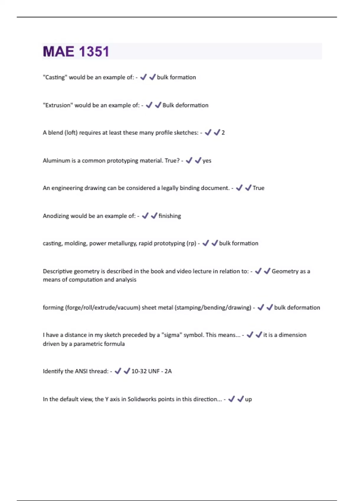 "Casting" would be an example of: - bulk formation "Extrusion" would be an example of: - Bulk deformation A blend (loft) requires at least these many profile sketches: - 2 Aluminum is a common prototyping material. True? - yes An engineering drawing can be considered a legally binding document. - True Anodizing would be an example of: - finishing casting, molding, power metallurgy, rapid prototyping (rp) - bulk formation Descriptive geometry is described in the book and video lecture in relation to: - Geometry as a means of computation and analysis forming (forge/roll/extrude/vacuum) sheet metal (stamping/bending/drawing) - bulk deformation I have a distance in my sketch preceded by a "sigma" symbol. This means... - it is a dimension driven by a parametric formula Identify the ANSI thread: - 10-32 UNF - 2A In the default view, the Y axis in Solidworks points in this direction... - up