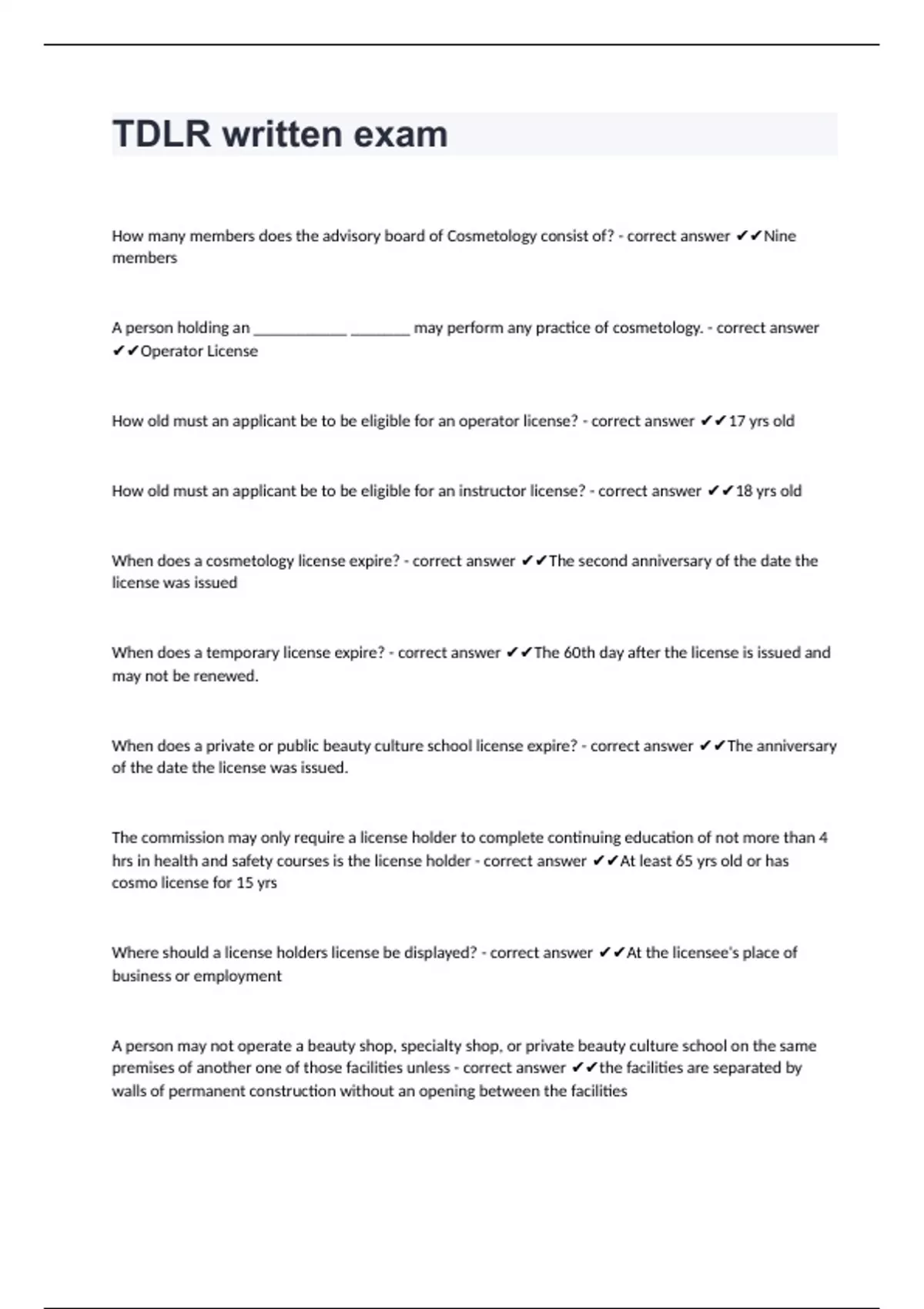 A person may not operate a beauty shop, specialty shop, or private beauty culture school on the same premises of another one of those facilities unless - correct answer ✔✔the facilities are separated by walls of permanent construction without an opening between the facilities a person holding an operating license, instructor license, or specialty certificate may not perform any practice of cosmetology if the person - correct answer ✔✔is suffering from an infectious or contagious disease