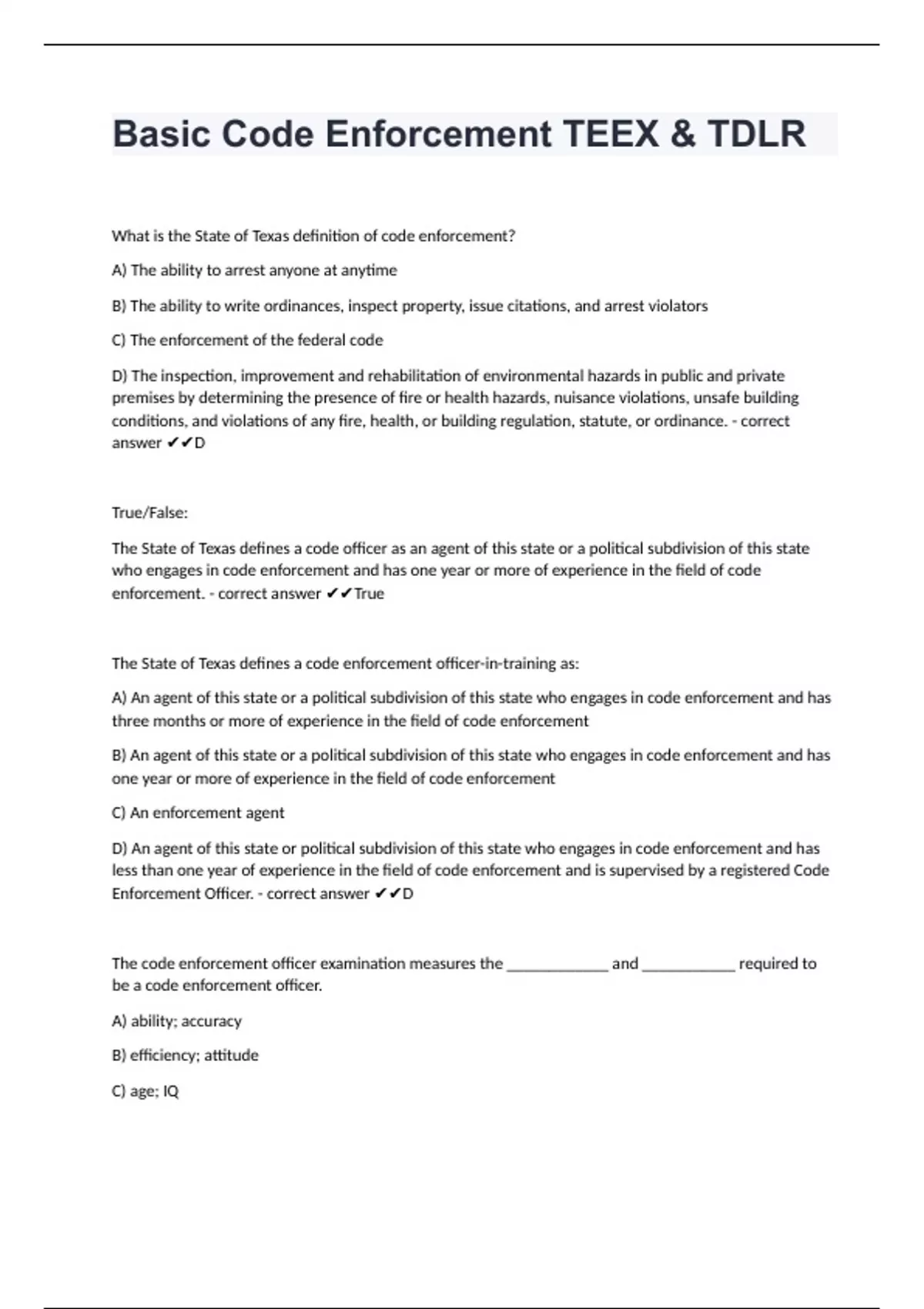 Basic Code Enforcement TEEX & TDLR fully solved graded A+
