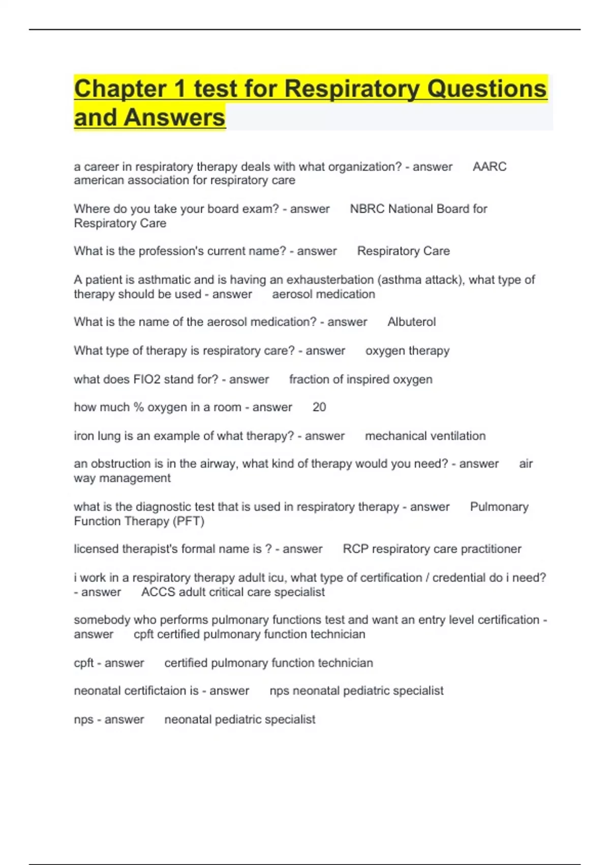 Chapter 1 test for Respiratory Questions and Answers a career in respiratory therapy deals with what organization? AARC american association for respiratory care Where do you take your board exam? NBRC National Board for Respiratory Care Previous Play Next Rewind 10 seconds Move forward 10 seconds Unmute 0:06 / 0:15 Full screen Brainpower Read More What is the profession's current name? Respiratory Care A patient is asthmatic and is having an exhausterbation (asthma attack), what type of therapy should be used aerosol medication What is the name of the aerosol medication? Albuterol What type of therapy is respiratory care? oxygen therapy what does FIO2 stand for? fraction of inspired oxygen how much % oxygen in a room 20 iron lung is an example of what therapy? mechanical ventilation an obstruction is in the airway, what kind of therapy would you need? air way management what is the diagnostic test that is used in respiratory therapy Pulmonary Function Therapy (PFT) licensed therapist's formal name is ? RCP respiratory care practitioner i work in a respiratory therapy adult icu, what type of certification / credential do i need? ACCS adult critical care specialist somebody who performs pulmonary functions test and want an entry level certification cpft certified pulmonary function technician cpft certified pulmonary function technician neonatal certifictaion is nps neonatal pediatric specialist nps neonatal pediatric specialist entry level certification is called certifited respiratory therapy technician crtt certified respiratory therapy technician advanced certification is called resgistered respiratory therapist hippocratus father of medicine boil's law volume and pressure graham's law law of diffusion for gases dalton's law partial pressure Joseph Louis Gay Lussac relationship between gas temperature and PRESSURE charle's law relationship between gas temperature and VOLUME IN 1774 WHO DISCOVERED oxygen joseph priestly