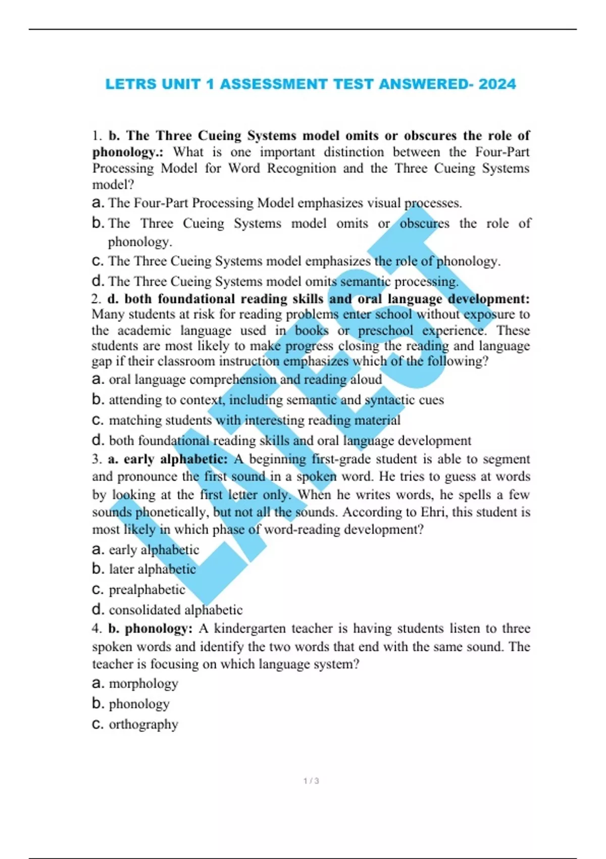 1. b. The Three Cueing Systems model omits or obscures the role of