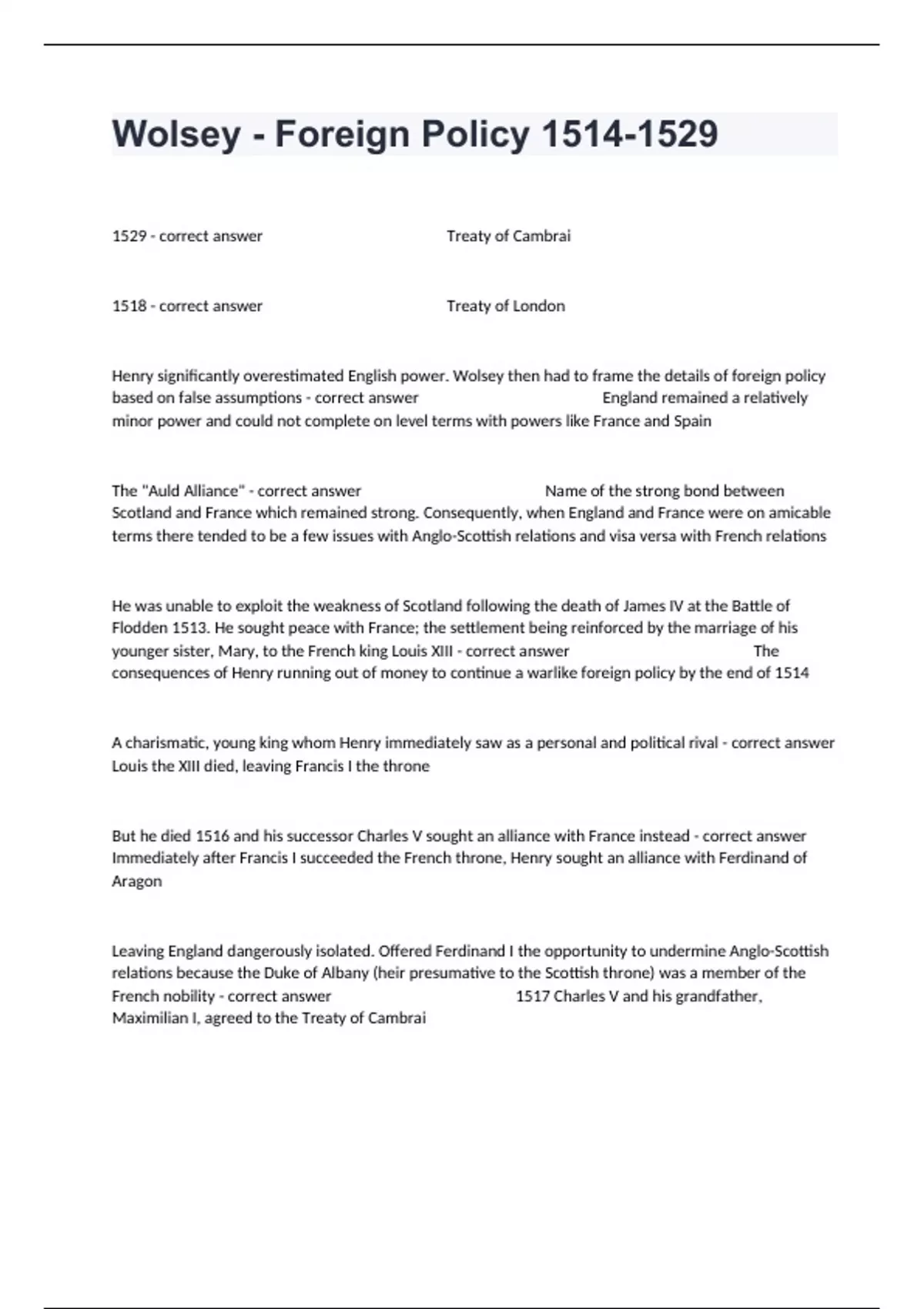 Henry significantly overestimated English power. Wolsey then had to frame the details of foreign policy based on false assumptions - correct answer England remained a relatively minor power and could not complete on level terms with powers like France and Spain