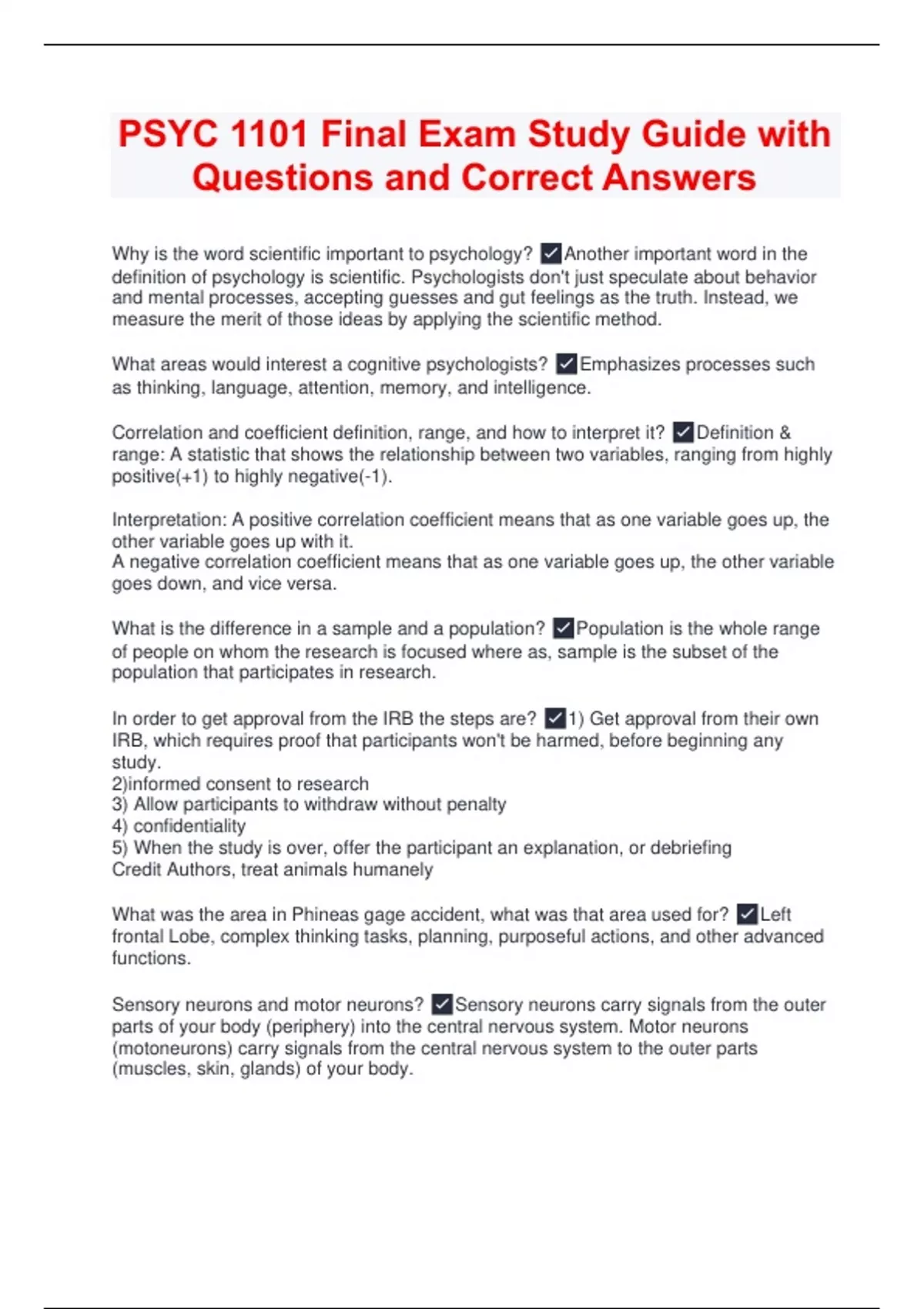Why is the word scientific important to psychology? Another important word in the definition of psychology is scientific. Psychologists don't just speculate about behavior and mental processes, accepting guesses and gut feelings as the truth. Instead, we measure the merit of those ideas by applying the scientific method. What areas would interest a cognitive psychologists? Emphasizes processes such as thinking, language, attention, memory, and intelligence. Correlation and coefficient definition, range, and how to interpret it? Definition & range: A statistic that shows the relationship between two variables, ranging from highly positive(+1) to highly negative(-1). Interpretation: A positive correlation coefficient means that as one variable goes up, the other variable goes up with it. A negative correlation coefficient means that as one variable goes up, the other variable goes down, and vice versa. What is the difference in a sample and a population? Population is the whole range of people on whom the research is focused where as, sample is the subset of the population that participates in research. In order to get approval from the IRB the steps are? 1) Get approval from their own IRB, which requires proof that participants won't be harmed, before beginning any study. 2)informed consent to research 3) Allow participants to withdraw without penalty 4) confidentiality 5) When the study is over, offer the participant an explanation, or debriefing Credit Authors, treat animals humanely What was the area in Phineas gage accident, what was that area used for? Left frontal Lobe, complex thinking tasks, planning, purposeful actions, and other advanced functions. Sensory neurons and motor neurons? Sensory neurons carry signals from the outer parts of your body (periphery) into the central nervous system. Motor neurons (motoneurons) carry signals from the central nervous system to the outer parts (muscles, skin, glands) of your body.