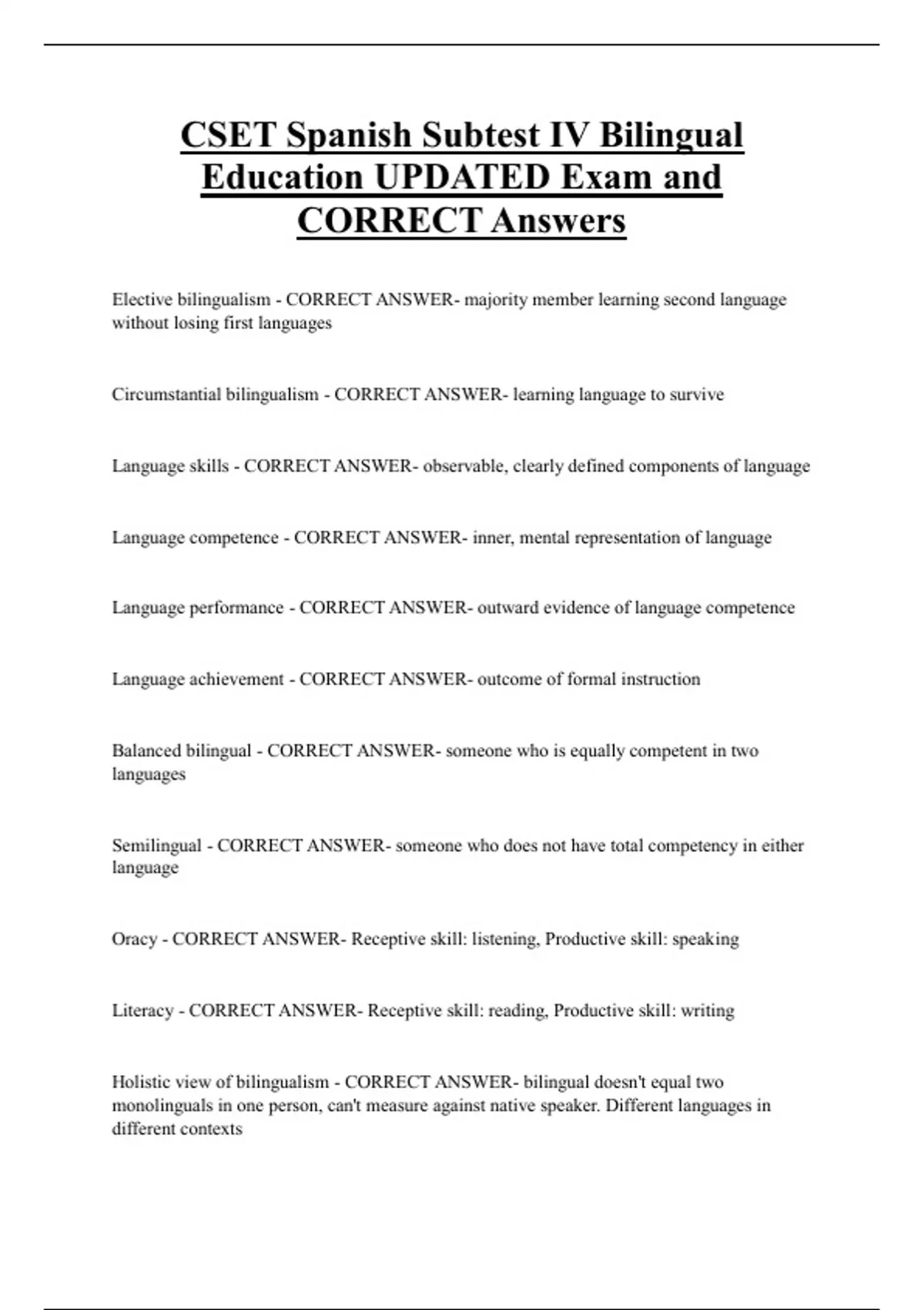 CSET Spanish Subtest IV Bilingual Education UPDATED Exam and CORRECT Answers Elective bilingualism - CORRECT ANSWER- majority member learning second language without losing first languages Circumstantial bilingualism - CORRECT ANSWER- learning language to survive Language skills - CORRECT ANSWER- observable, clearly defined components of language Language competence - CORRECT ANSWER- inner, mental representation of language Language performance - CORRECT ANSWER- outward evidence of language competence