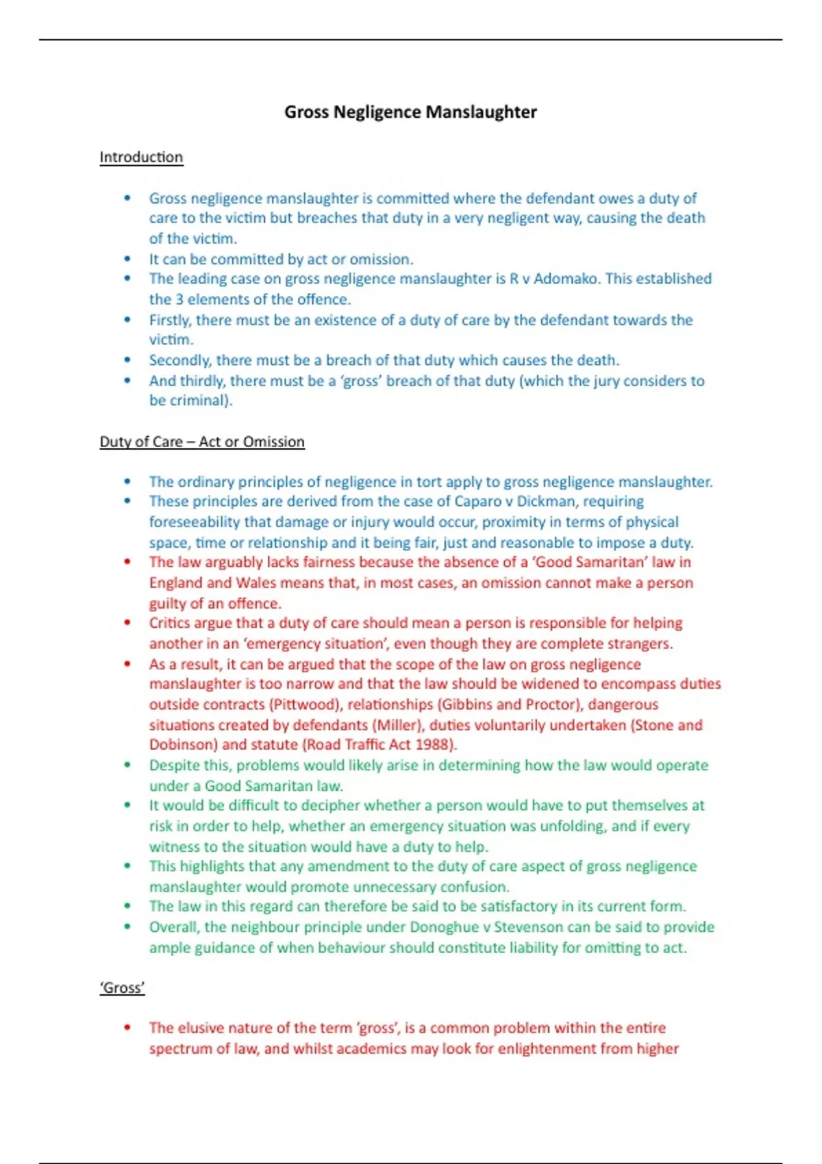 An in-depth evaluation of the law on gross negligence manslaughter. The plan provides a balanced argument and is of an A* standard.