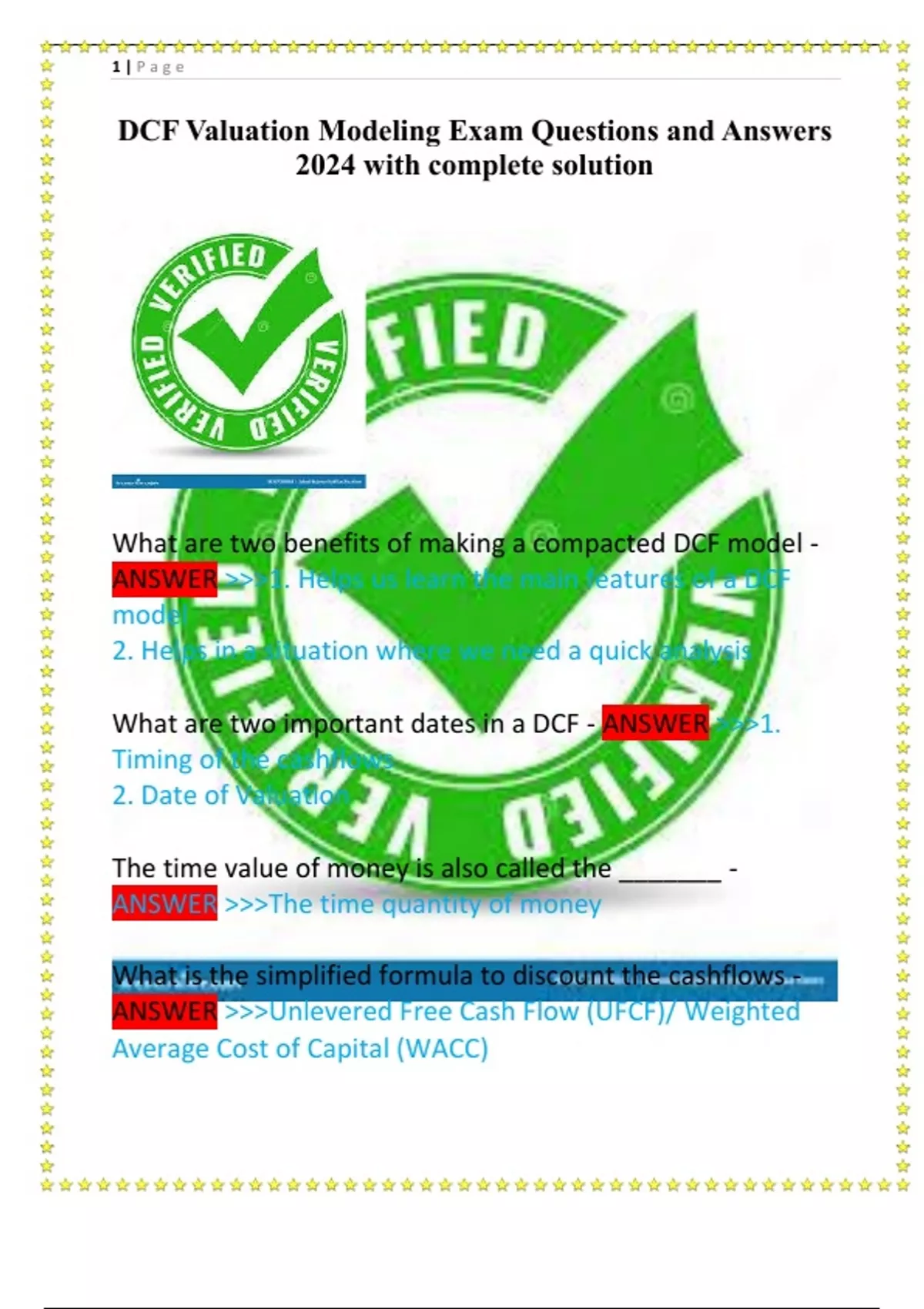 1 | P a g e DCF Valuation Modeling Exam Questions and Answers 2024 with complete solution What are two b enefits of making a compacted DCF model - ANSWER >>>1. Helps us learn the main features of a DCF model 2. Helps in a situation where we need a quick analysis What are two important dates in a DCF - ANSWER >>>1. Timing of the cashflows 2. Date of Valuatio n The time value of money is also called the _______ - ANSWER >>>The time quantity of money What is the simplified formula to discount the cashflows - ANSWER >>>Unlevered Free Cash Flow (UFCF)/ Weighted Average Cost of Capital (WACC) 2 | P a g e What are the three types of valuation techniques? - ANSWER >>>Discounted Cashflow Analysis Comparable Trading Analysis President Transaction analysis Define Unlevered Free Cashflow - ANSWER >>>Cash flow available to all capital providers Define Weighted Average Cost of Capital - ANSWER >>>The cost of capital from all capital providers What is the Enterprise Value in a DCF using Free Cashflows - ANSWER >>>Enterprise value = PV of UFCF/WACC How long into the future should we forecast in a DCF? - ANSWER >>>In perpetuity (This is a common interview question) What are the two parts of a DCF? - ANSWER >>>1. Discrete Forecast 2. Terminal Value What is a terminal value of a firm? - ANSWER >>> When is the start and end of the discrete forecast? - ANSWER >>>It starts when the company is growing faster 3 | P a g e than the overall economy and ends when the company grows at the same rate of the economy When is the start and end of a Terminal Value forecast? - ANSWER >>>The Terminal value forecast starts when the company exp eriences the same amount of growth as the overall economy and then continues forever (Using a growing perpetuity formula) Perpetuity Growth formula - ANSWER >>>PV1=CF2/(R -G) PV=Present Value of cashflow CF=Cashflow of the next year R= Required Return G=Growth Rate What does Enterprise Value represent? - ANSWER >>>Our view of the companies value Equity Value formula - ANSWER >>>Equity Value = Enterprise Value - Net Debt What is Net Debt formula? - ANSWER >>>Total Debt - Cash = Net Debt