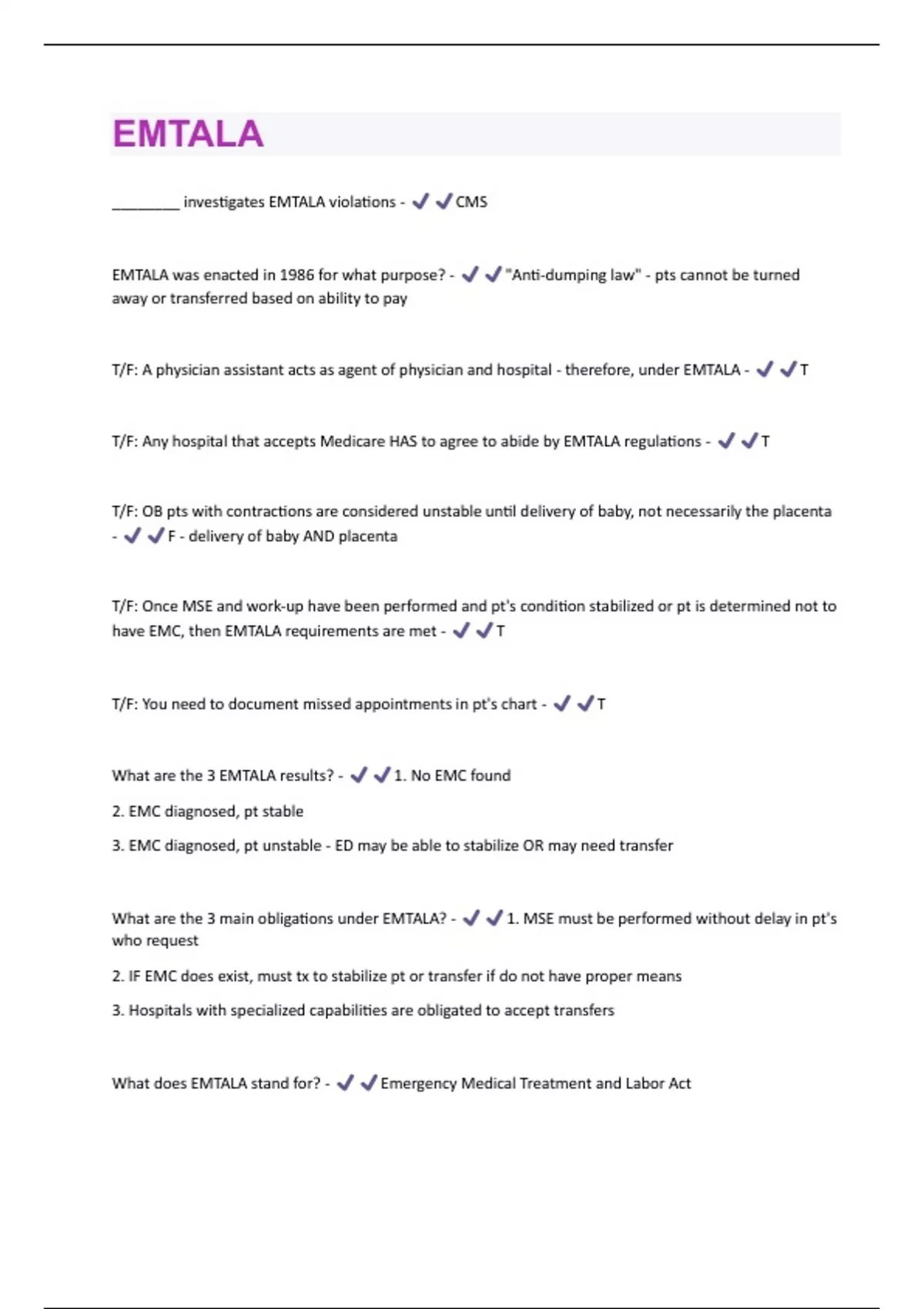 ________ investigates EMTALA violations - CMS EMTALA was enacted in 1986 for what purpose? - "Anti-dumping law" - pts cannot be turned away or transferred based on ability to pay T/F: A physician assistant acts as agent of physician and hospital - therefore, under EMTALA - T T/F: Any hospital that accepts Medicare HAS to agree to abide by EMTALA regulations - T T/F: OB pts with contractions are considered unstable until delivery of baby, not necessarily the placenta - F - delivery of baby AND placenta T/F: Once MSE and work-up have been performed and pt's condition stabilized or pt is determined not to have EMC, then EMTALA requirements are met - T T/F: You need to document missed appointments in pt's chart - T What are the 3 EMTALA results? - 1. No EMC found 2. EMC diagnosed, pt stable 3. EMC diagnosed, pt unstable - ED may be able to stabilize OR may need transfer What are the 3 main obligations under EMTALA? - 1. MSE must be performed without delay in pt's who request 2. IF EMC does exist, must tx to stabilize pt or transfer if do not have proper means 3. Hospitals with specialized capabilities are obligated to accept transfers What does EMTALA stand for? - Emergency Medical Treatment and Labor ActWhat is a medical condition with sufficient severity(pain, psych, substance abuse, preg, labor) such that the absence of immediate med attention could place the pt's health at risk? - Emergency Medical Condition (EMC) What is included in the MSE process? - H&P along with appropriate tests available at institution What is the most common EMTALA violation? - Facility does not provide an adequate and timely MSE What is the process required to reach a reasonable clinical confidence the point at which it can be determined whether a medical emergency does or does not exist? - Medical Screening Exam (MSE) You cannot transfer an unstable pt unless... - Pt requests transfer(in writing) and is aware of risks/benefits OR physician certifies benefits outweigh risk