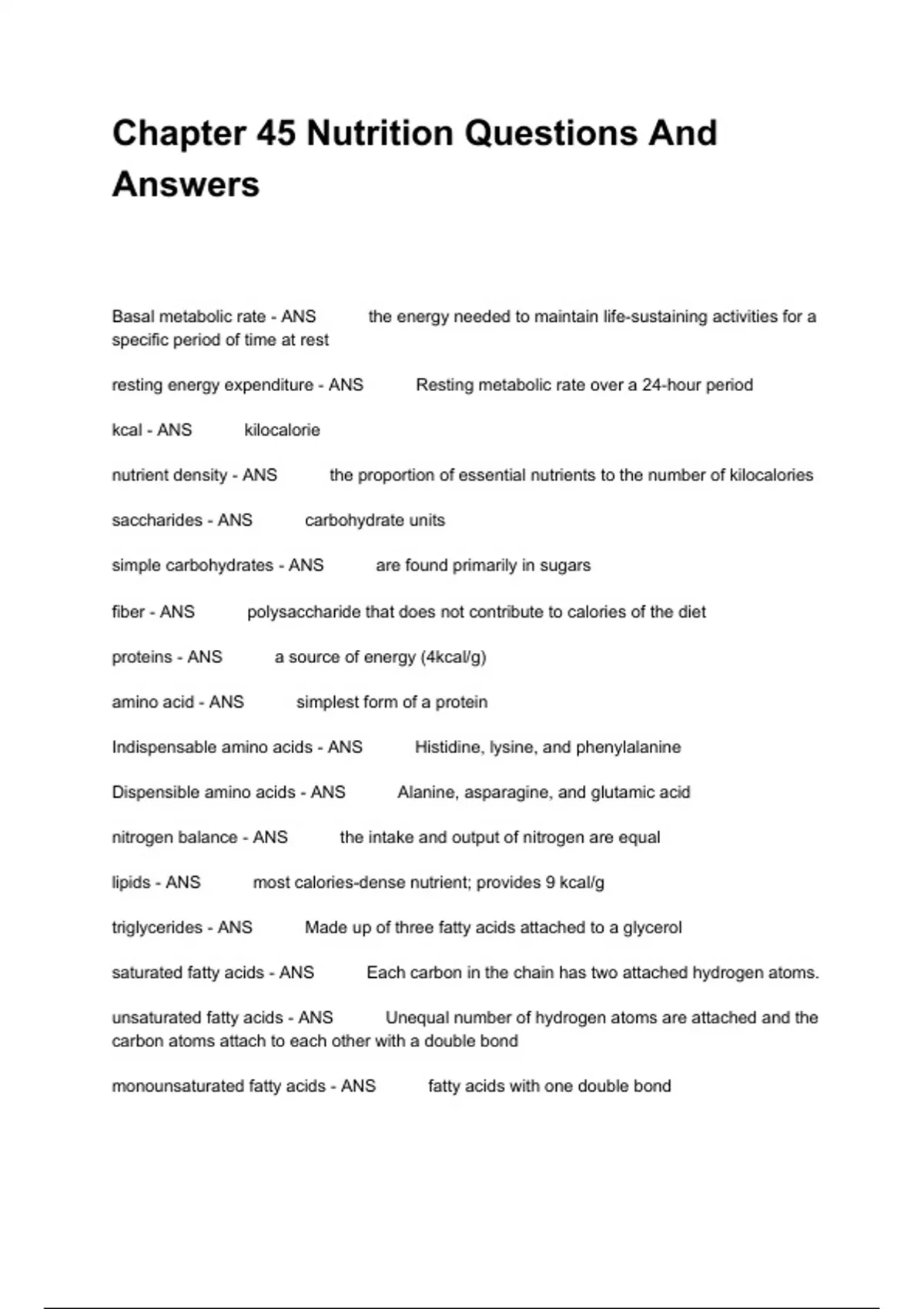 Basal metabolic rate - ANS the energy needed to maintain life-sustaining activities for a specific period of time at rest resting energy expenditure - ANS Resting metabolic rate over a 24-hour period kcal - ANS kilocalorie nutrient density - ANS the proportion of essential nutrients to the number of kilocalories saccharides - ANS carbohydrate units simple carbohydrates - ANS are found primarily in sugars fiber - ANS polysaccharide that does not contribute to calories of the diet proteins - ANS a source of energy (4kcal/g) amino acid - ANS simplest form of a protein Indispensable amino acids - ANS Histidine, lysine, and phenylalanine Dispensible amino acids - ANS Alanine, asparagine, and glutamic acid nitrogen balance - ANS the intake and output of nitrogen are equal lipids - ANS most calories-dense nutrient; provides 9 kcal/g triglycerides - ANS Made up of three fatty acids attached to a glycerol saturated fatty acids - ANS Each carbon in the chain has two attached hydrogen atoms. unsaturated fatty acids - ANS Unequal number of hydrogen atoms are attached and the carbon atoms attach to each other with a double bond monounsaturated fatty acids - ANS fatty acids with one double bond polyunsaturated fatty aicds - ANS fatty acids that have two or more double carbon bonds water - ANS makes up 60%-70% of total body weight fat-soluble vitamins - ANS Vitamins A, D, E, K hypervitaminosis - ANS results from megadoses of supplemental vitamins, fortified food, and large intake of fish oils water-soluble vitamins - ANS vitamin c and B complex trace elements - ANS Inorganic elements that act as catalysts in biochemical reactions enzymes - ANS protein like substances that act as catalysts to speed up chemical reactions peristalsis - ANS wave-like muscular contractions chyme - ANS acidic liquefied mass active transport - ANS particles move from an area of greater concentration to an area of lesser concentration passive diffusion - ANS Force by which particles move outward from an area of greater concentration to lesser concentration osmosis - ANS movement of water through a membrane that separates solutions of different concentrations, do not need a special carrier pinocytosis - ANS engulfing large molecules of nutrients by the absorbing cell metabolism - ANS all biochemical reactions within cells of the body