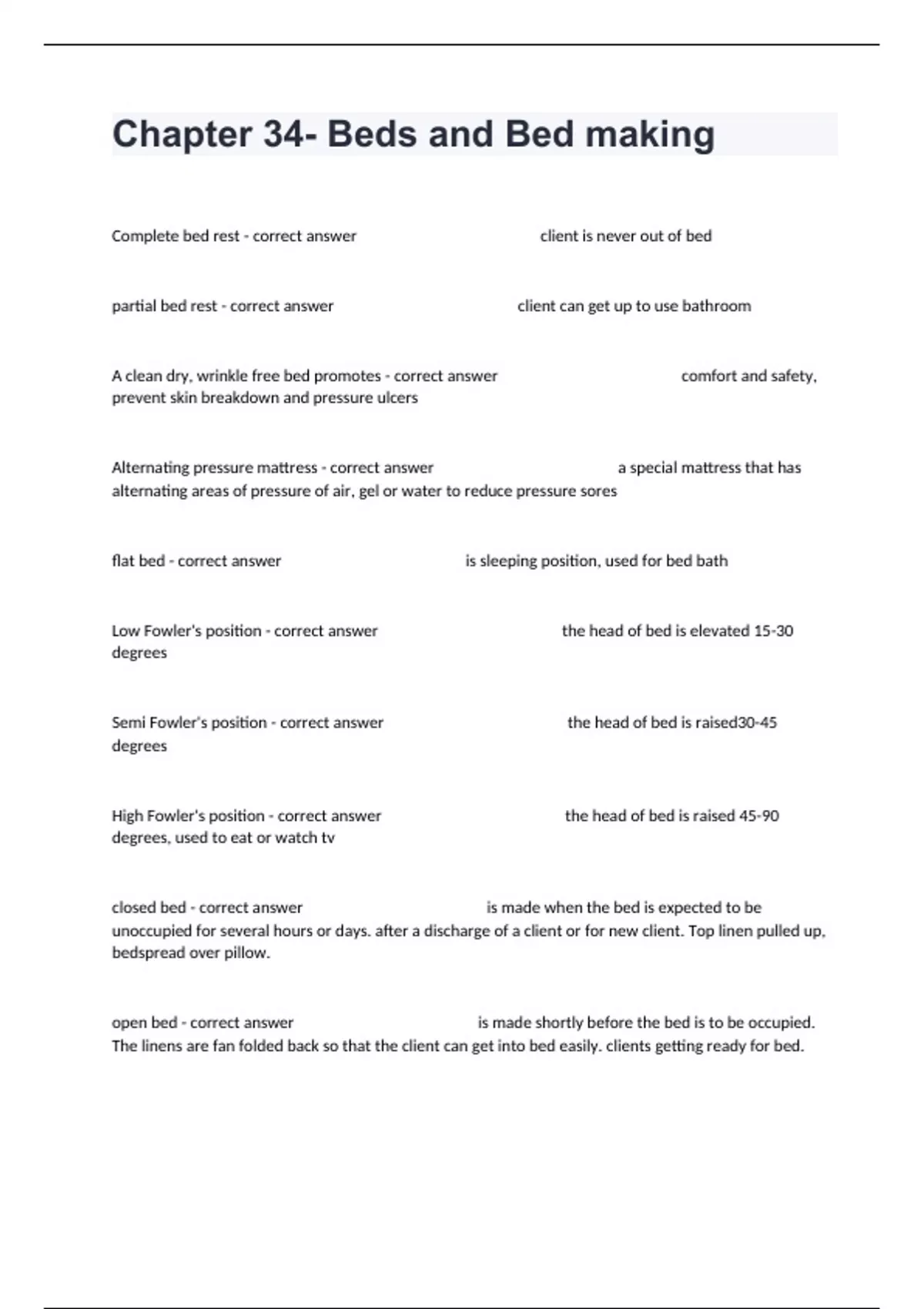 Complete bed rest - correct answer client is never out of bed partial bed rest - correct answer client can get up to use bathroom A clean dry, wrinkle free bed promotes - correct answer comfort and safety, prevent skin breakdown and pressure ulcers Alternating pressure mattress - correct answer a special mattress that has alternating areas of pressure of air, gel or water to reduce pressure sores flat bed - correct answer is sleeping position, used for bed bath Low Fowler's position - correct answer the head of bed is elevated 15-30 degrees Semi Fowler's position - correct answer the head of bed is raised30-45 degrees High Fowler's position - correct answer the head of bed is raised 45-90 degrees, used to eat or watch tv closed bed - correct answer is made when the bed is expected to be unoccupied for several hours or days. after a discharge of a client or for new client. Top linen pulled up, bedspread over pillow. open bed - correct answer is made shortly before the bed is to be occupied. The linens are fan folded back so that the client can get into bed easily. clients getting ready for bed. Surgical bed - correct answer is an open bed that linens are fan folded narrow at the foot of bed so a person can be transferred from stretcher to bed easily. (feet don't get caught) Occupied bed - correct answer is made when the client stays in the bed .Cover client with top sheet Four things to keep in mind when doing an occupied bed - correct answer 1) keep client in good alignment 2) follow care plan of clients movement restrictions 3)EXPLAIN procedure to client before you do it 4) raise bed to maintain good body mechanics Most important concept in bedmaking - correct answer the bottom sheet and incontinence pad must remain wrinkle free to prevent bedsores and skin breakdown.