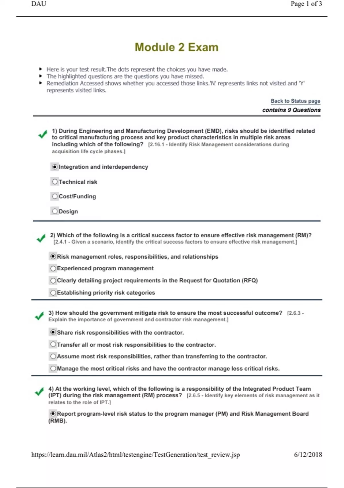 Module 2 Exam Here is your test result.The dots represent the choices you have made. The highlighted questions are the questions you have missed. Remediation Accessed shows whether you accessed those links.'N' represents links not visited and 'Y' represents visited links. Back to Status page contains 9 Questions 1) During Engineering and Manufacturing Development (EMD), risks should be identified related to critical manufacturing process and key product characteristics in multiple risk areas including which of the following? [2.16.1 - Identify Risk Management considerations during acquisition life cycle phases.] Integration and interdependency Technical risk Cost/Funding Design 2) Which of the following is a critical success factor to ensure effective risk management (RM)? [2.4.1 - Given a scenario, identify the critical success factors to ensure effective risk management.] Risk management roles, responsibilities, and relationships Experienced program management Clearly detailing project requirements in the Request for Quotation (RFQ) Establishing priority risk categories 3) How should the government mitigate risk to ensure the most successful outcome? Explain the importance of government and contractor risk management.] Share risk responsibilities with the contractor. Transfer all or most risk responsibilities to the contractor. Assume most risk responsibilities, rather than transferring to the contractor. Manage the most critical risks and have the contractor manage less critical risks. [2.6.3 4) At the working level, which of the following is a responsibility of the Integrated Product Team (IPT) during the risk management (RM) process? [2.6.5 - Identify key elements of risk management as it relates to the role of IPT.] Report program-level risk status to the program manager (PM) and Risk Management Board (RMB). 6
