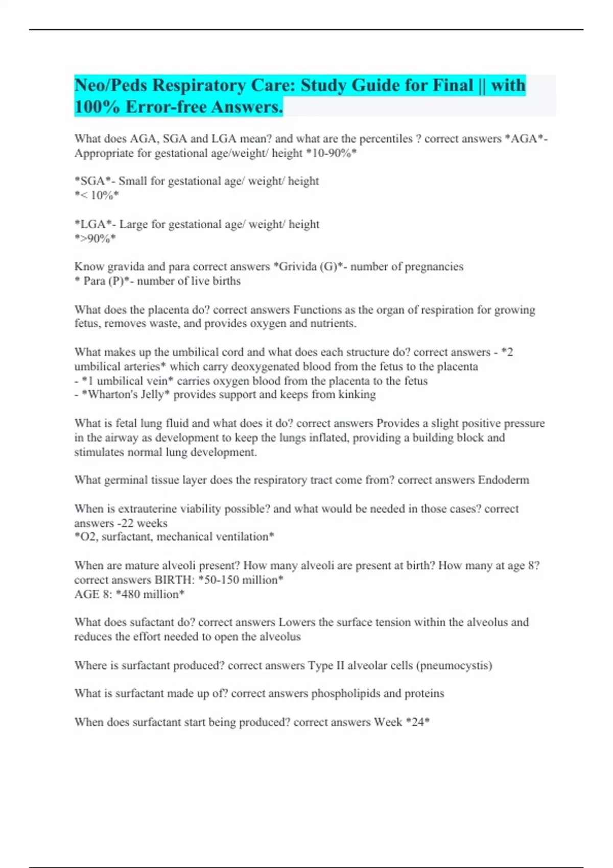 What does AGA, SGA and LGA mean? and what are the percentiles ? correct answers *AGA*- Appropriate for gestational age/weight/ height *10-90%* *SGA*- Small for gestational age/ weight/ height *< 10%* *LGA*- Large for gestational age/ weight/ height *>90%* Know gravida and para correct answers *Grivida (G)*- number of pregnancies * Para (P)*- number of live births What does the placenta do? correct answers Functions as the organ of respiration for growing fetus, removes waste, and provides oxygen and nutrients. What makes up the umbilical cord and what does each structure do? correct answers - *2 umbilical arteries* which carry deoxygenated blood from the fetus to the placenta - *1 umbilical vein* carries oxygen blood from the placenta to the fetus - *Wharton's Jelly* provides support and keeps from kinking What is fetal lung fluid and what does it do? correct answers Provides a slight positive pressure in the airway as development to keep the lungs inflated, providing a building block and stimulates normal lung development. What germinal tissue layer does the respiratory tract come from? correct answers Endoderm When is extrauterine viability possible? and what would be needed in those cases? correct answers -22 weeks *O2, surfactant, mechanical ventilation* When are mature alveoli present? How many alveoli are present at birth? How many at age 8? correct answers BIRTH: *50-150 million* AGE 8: *480 million* What does sufactant do? correct answers Lowers the surface tension within the alveolus and reduces the effort needed to open the alveolus Where is surfactant produced? correct answers Type II alveolar cells (pneumocystis) What is surfactant made up of? correct answers phospholipids and proteins When does surfactant start being produced? correct answers Week *24*