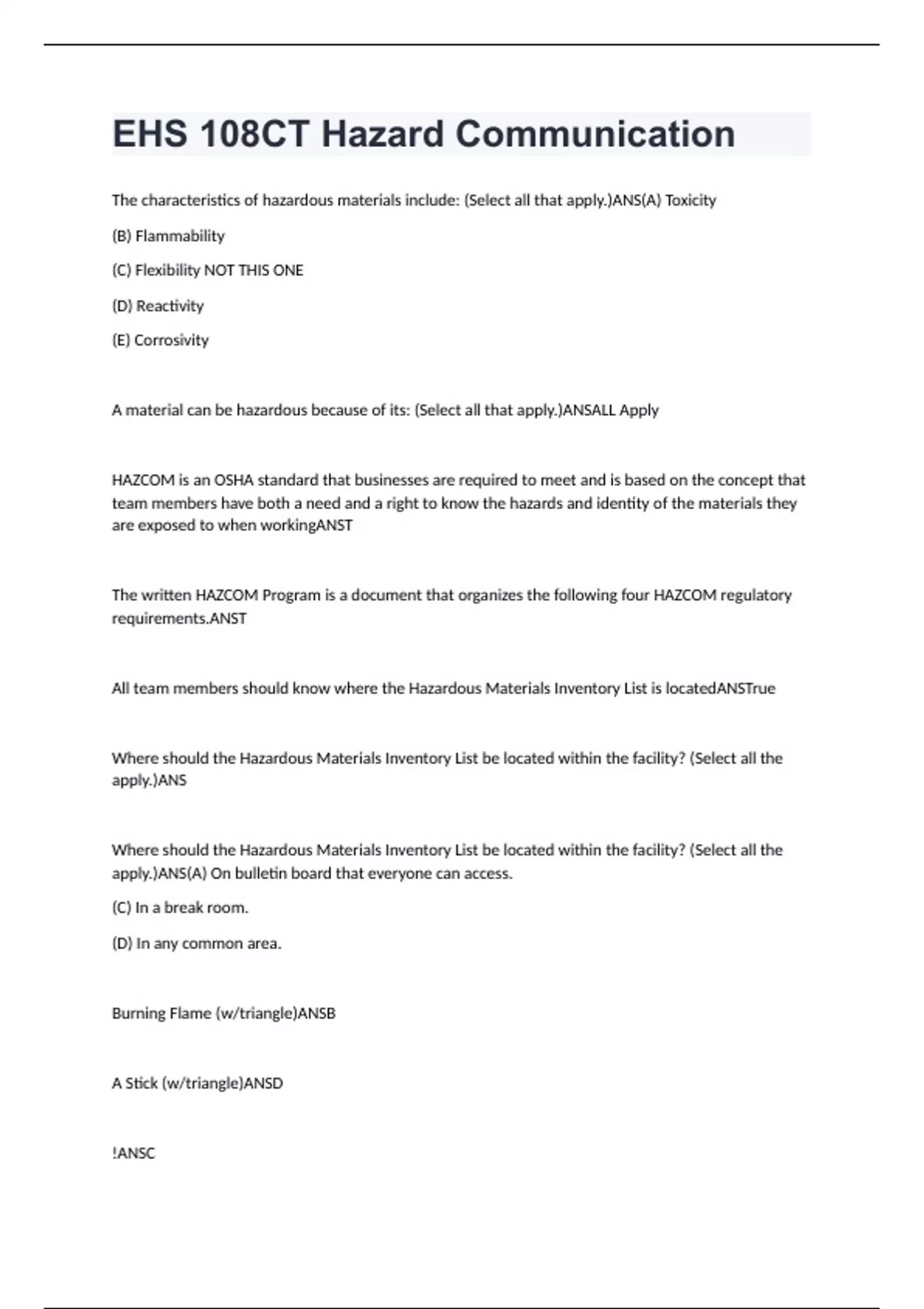 EHS 108CT Hazard Communication 2023 Exam Questions With Correct Answers