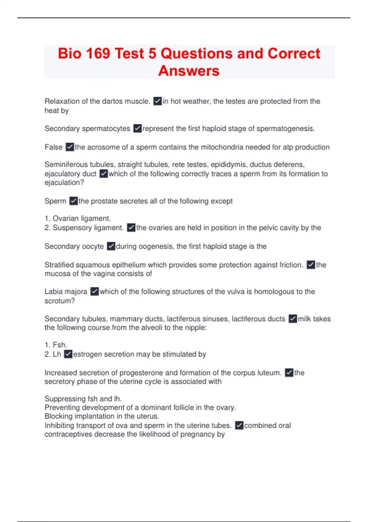 Relaxation of the dartos muscle. in hot weather, the testes are protected from the heat by Secondary spermatocytes represent the first haploid stage of spermatogenesis. False the acrosome of a sperm contains the mitochondria needed for atp production Seminiferous tubules, straight tubules, rete testes, epididymis, ductus deferens, ejaculatory duct which of the following correctly traces a sperm from its formation to ejaculation? Sperm the prostate secretes all of the following except 1. Ovarian ligament. 2. Suspensory ligament. the ovaries are held in position in the pelvic cavity by the Secondary oocyte during oogenesis, the first haploid stage is the Stratified squamous epithelium which provides some protection against friction. the mucosa of the vagina consists of Labia majora which of the following structures of the vulva is homologous to the scrotum? Secondary tubules, mammary ducts, lactiferous sinuses, lactiferous ducts milk takes the following course from the alveoli to the nipple: 1. Fsh. 2. Lh estrogen secretion may be stimulated by Increased secretion of progesterone and formation of the corpus luteum. the secretory phase of the uterine cycle is associated with Suppressing fsh and lh. Preventing development of a dominant follicle in the ovary. Blocking implantation in the uterus. Inhibiting transport of ova and sperm in the uterine tubes. combined oral contraceptives decrease the likelihood of pregnancy by