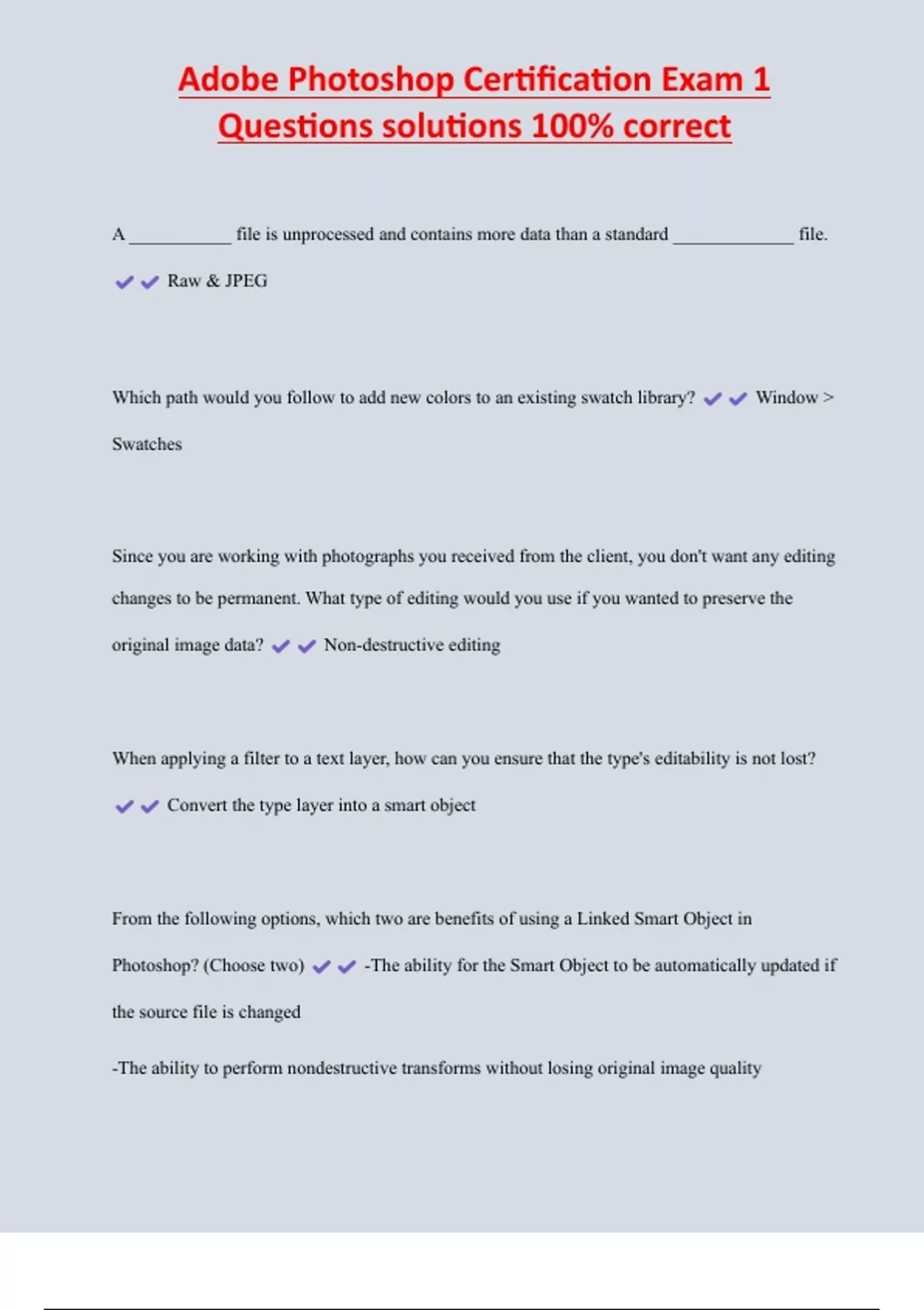 Adobe Photoshop Certification Exam 1 Questions solutions 100% correct A ___________ file is unprocessed and contains more data than a standard _____________ file. Raw & JPEG Which path would you follow to add new colors to an existing swatch library? Window Swatches Since you are working with photographs you received from the client, you don't want any editing changes to be permanent. What type of editing would you use if you wanted to preserve the original image data? Non-destructive editing When applying a filter to a text layer, how can you ensure that the type's editability is not lost? Convert the type layer into a smart object