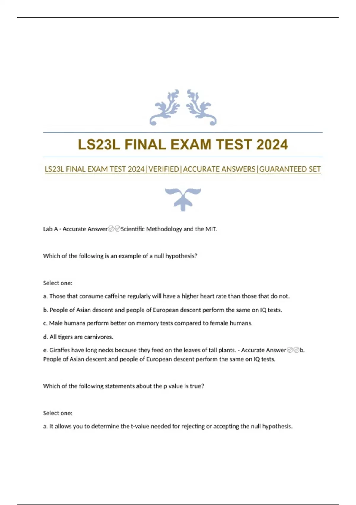 LS23L FINAL EXAM TEST 2024 LS23L FINAL EXAM TEST 2024|VERIFIED|ACCURATE ANSWERS|GUARANTEED SET Lab A - Accurate AnswerScientific Methodology and the MIT. Which of the following is an example of a null hypothesis? Select one: a. Those that consume caffeine regularly will have a higher heart rate than those that do not. b. People of Asian descent and people of European descent perform the same on IQ tests. c. Male humans perform better on memory tests compared to female humans. d. All tigers are carnivores. e. Giraffes have long necks because they feed on the leaves of tall plants. - Accurate Answerb. People of Asian descent and people of European descent perform the same on IQ tests. Which of the following statements about the p value is true? Select one: a. It allows you to determine the t-value needed for rejecting or accepting the null hypothesis. b. It gives the probability that you are making a mistake in accepting the experimental null hypothesis. c. Only a p value smaller than 0.5 is statistically significant. d. The larger the p value, the more significant your results are. e. It gives the probability that you are making a mistake in accepting the experimental hypothesis. - Accurate Answere. It gives the probability that you are making a mistake in accepting the experimental hypothesis. If a student claims that females answered on average a greater number of correct responses than males on the picture MIT test, what evidence does the student need to gather in order to better support this hypothesis? Select one: a. Verify that the standard deviation is greater than 5 b. See if the degrees of freedom is greater than 1,000 c. Check if the T-value is greater than 0.05 d. Show that the null hypothesis has a high probability of being incorrect e. Check if the T-value is 5% or less - Accurate Answerd. Show that the null hypothesis has a high probability of being incorrect A scientist is interested in studying the parasite responsible for malaria and wants to study the effects of different variables on the parasite's ability to cause disease. She hypothesizes that the parasite is more pathogenic in environments containing glucose. Which of the following most accurately captures the null hypothesis of her experiment? Select one: a. The parasite cannot use glucose b. The parasite is less pathogenic in environments without glucose. c. The parasite switches modes of metabolism in the presence of lactose. d. The parasite is more pathogenic in environments with high glucose levels. e. The parasite's pathogenicity is not affected by environmental glucose levels. - Accurate Answere. The parasite's pathogenicity is not affected by environmental glucose levels. In a recent study, scientists proposed the following hypothesis: "Consumption of Omega-3 fatty acid can reduce the size of cancerous tumors." The following hypothesis was tested. A sample of 500 rats with tumors was collected. Within this sample size, 250 rats were fed with omega-3 (Group 1) while the remaining 250 rats were not (Group 2). After one month of periodically feeding Group 1 with Omega-3 fatty acid, rat autopsies were taken for both groups. The average changes of tumor size were measured and recorded. Average Change in Tumor Size Group 1: -0.124 g Group 2: -0.012 g Degrees of Freedom: 498 T-test: 2.061 P-value: 0.04 Based on the results from the experiment, which of the following is the best conclusion? Select one: a. Consumption of Omega-3 fatty acid has no effect on decreasing the size of previous cancerous tumors. b. Consumption of Omega-3 fatty acid decreases the size of previous cancerous tumors wit - Accurate Answerb. Consumption of Omega-3 fatty acid decreases the size of previous cancerous tumors with statistical significance. In order to reject the null hypothesis in the Memory Interference Test (MIT) lab Select one: a. The t-test value must be less than 0.05 b. The p value must be less than 0.05 c. Both the p value and the t-test value must be less than 0.05 d. The t-test value must be greater than 0.05 e. The p value must be greater than 0.05 - Accurate Answerb. The p value must be less than 0.05 What is the difference between a p-value and t-value? Select one: a. All of these statements are correct b. The t-value tells you the probability that the null hypothesis is correct while the p-value is the first step to finding the t-value. c. The p-value tells you the probability that the null hypothesis is correct while the t-value is the first step to finding the p-value. d. There is no difference between the two values e. The t-value gives you a value between 0 and 1 while the p-value does not have a range of numbers. - Accurate Answerc. The p-value tells you the probability that the null hypothesis is correct while the t-value is the first step to finding the p-value. As a statistician, you conducted an experiment and obtained a t-test value for the two experimental groups. At a confidence level of 5 percent, the corresponding statistical p-value of 0.067 would suggest that: Select one: a. The inherent error of the experiment is calculated to be 6.7 percent. b. The two experimental groups are statistically identical. c. There is a 6.7 percent probability that you are making a mistake by failing to reject the null hypothesis. d. There is a 6.7 percent probability that you are making a mistake in accepting the experimental hypothesis. e. There is probably a statistically significant difference between the two groups of interest. - Accurate Answerd. There is a 6.7 percent probability that you are making a mistake in accepting the experimental hypothesis. The MIT database gives a t-test value of 2.581, which correspond to a p-value of 0.01 for your null hypothesis. According to the hypothetico-deductive approach, what is the next step you should take? Select one: a. Use inferential statistics to compare the populations. b. Make new observations about your populations. c. Retain your n