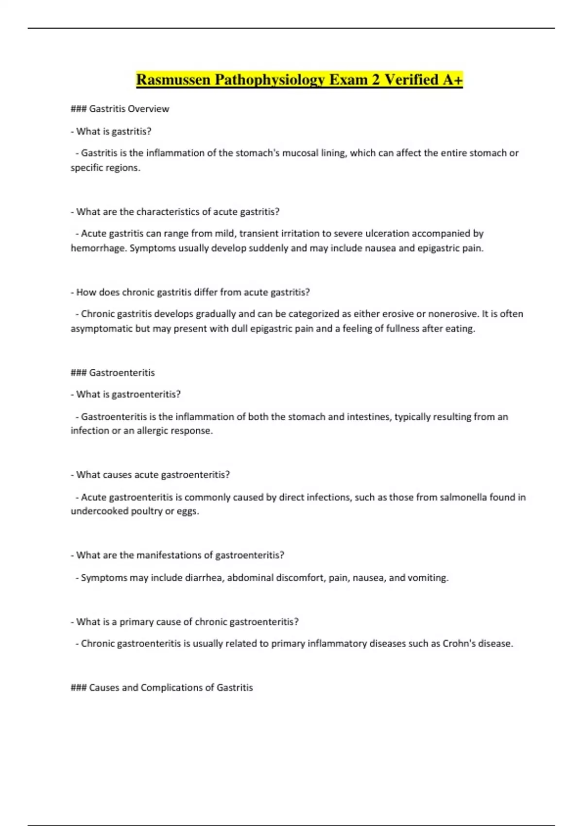 Rasmussen Pathophysiology Exam 2 Verified A+ ### Gastritis Overview - What is gastritis? - Gastritis is the inflammation of the stomach's mucosal lining, which can affect the entire stomach or specific regions. - What are the characteristics of acute gastritis? - Acute gastritis can range from mild, transient irritation to severe ulceration accompanied by hemorrhage. Symptoms usually develop suddenly and may include nausea and epigastric pain. - How does chronic gastritis differ from acute gastritis? - Chronic gastritis develops gradually and can be categorized as either erosive or nonerosive. It is often asymptomatic but may present with dull epigastric pain and a feeling of fullness after eating. ### Gastroenteritis - What is gastroenteritis? - Gastroenteritis is the inflammation of both the stomach and intestines, typically resulting from an infection or an allergic response. - What causes acute gastroenteritis? - Acute gastroenteritis is commonly caused by direct infections, such as those from salmonella found in undercooked poultry or eggs. - What are the manifestations of gastroenteritis? - Symptoms may include diarrhea, abdominal discomfort, pain, nausea, and vomiting. - What is a primary cause of chronic gastroenteritis? - Chronic gastroenteritis is usually related to primary inflammatory diseases such as Crohn's disease. ### Causes and Complications of Gastritis - What are the main causes of gastritis? - Gastritis can result from various factors, including infections (particularly Helicobacter pylori), long term use of NSAIDs, excessive alcohol consumption, severe stress, and certain autoimmune conditions. - What complications can arise from chronic gastritis? - Complications may include peptic ulcers, gastric cancer, and hemorrhage. ### Gastroesophageal Reflux Disease (GERD) - What is GERD? - Gastroesophageal Reflux Disease (GERD) occurs when chyme or bile backs up from the stomach into the esophagus, causing irritation of the esophageal mucosa due to gastric secretions. - What are common triggers for GERD? - Triggers may include certain foods (like chocolate, caffeine, and spicy dishes), alcohol, nicotine, obesity, pregnancy, and certain medications (e.g., corticosteroids, beta-blockers). - What symptoms are associated with GERD? - Symptoms include heartburn, epigastric pain after meals, dysphagia, a dry cough, regurgitation of food, and a sensation of a lump in the throat. - What complications are associated with GERD? - Potential complications can include esophagitis, strictures, ulcerations, esophageal cancer, and chronic pulmonary disease. ### Peptic Ulcer Disease (PUD) - What is Peptic Ulcer Disease (PUD)? - PUD refers to lesions affecting the lining of the stomach or duodenum, developing due to an imbalance between destructive forces and protective mechanisms. - What are the risk factors for Peptic Ulcer Disease? - Risk factors include male gender, advancing age, NSAID use, Helicobacter pylori infections, and certain gastric tumors. - What are the different types of peptic ulcers? - Types include duodenal ulcers, typically relieved by food, gastric ulcers, which worsen with eating, and stress ulcers, developing due to physiological stress. ### Stress Ulcers and Their Characteristics - What are stress ulcers? - Stress ulcers occur as a result of major physiological stressors, such as local tissue ischemia or tissue acidosis. - What are the specific types of stress ulcers? - Curling's ulcers are associated with burns, while Cushing's ulcers are linked to head injuries. - What complications can arise from PUD? - Complications of PUD may include gastrointestinal hemorrhage, obstruction, perforation, and peritonitis. ### Appendicitis - What is appendicitis? - Appendicitis is the inflammation of the vermiform appendix, usually triggered by an infection that causes local tissue edema and subsequent obstruction. - What are the main signs and symptoms of appendicitis? - Symptoms can range from asymptomatic to sudden, severe pain that localizes to the lower right quadrant of the abdomen (McBurney point), along with nausea and vomiting. - What are the potential complications of appendicitis? - Complications may include abscesses, peritonitis, gangrene, and even death.