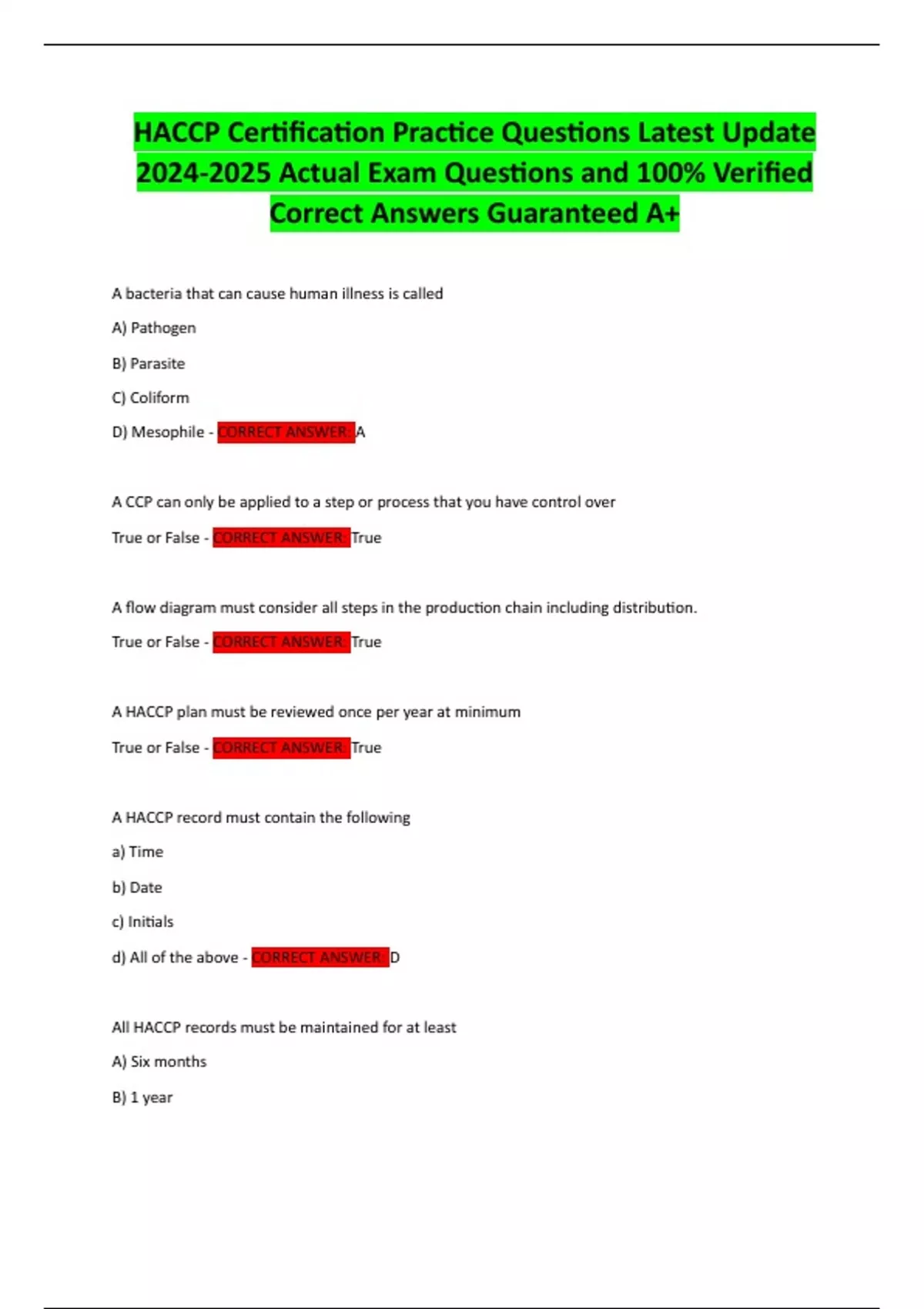 HACCP Certification Practice Questions Latest Update Actual Exam Questions and 100% Verified Correct Answers Guaranteed A+