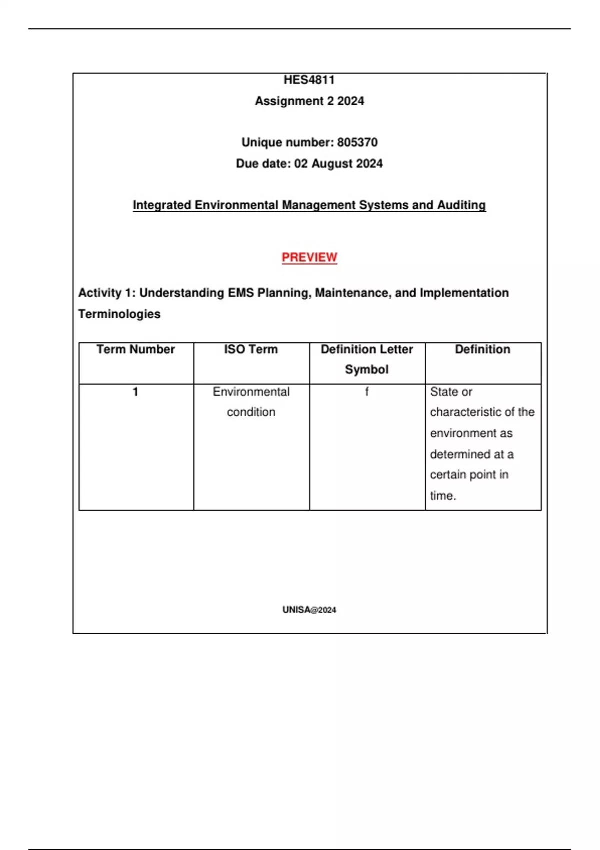 HES4811 Assignment 2 Full Solutions 2024 (805370) - DUE 2 August 2024 ;100 % TRUSTED workings, Expert Solved, Explanations and Solutions. For assistance call or W.h.a.t.s.a.p.p us on ...(.+.2.5.4.7.7.9.5.4.0.1.3.2)........... Activity 2.1 Understanding EMS planning, maintenance, and implementation terminologies [15 Marks] Indicate which definition is appropriate to the relevant ISO term by matching the term number with the definition’ letter symbol. Term Match ISO Definition Example: 0. Process 0 = A [1 mark] A) Set of interrelated or interacting activities which transforms inputs into outputs. 1. Environmental condition 1 = a) Measurable representation of the condition or status of operations, management or conditions. 2. Corrective action 2 = b) Extent to which planned activities are realized and planned results achieved. 3. Requirement 3 = c) Element of an organization’s activities or products or services that interacts or can interact with the environment. 4. Indicator 4 = d) Ability to apply knowledge and skills to achieve intended outcomes. 5. Effectiveness 5 = e) “Use of processes, practices, techniques, materials, products, services or energy to avoid, reduce or control (separately or in combination) the creation, emission or discharge of any type of pollutant or waste, in order to reduce adverse environmental impacts”. 6. Monitoring 6 = f) State or characteristic of the environment as determined at a certain point in time. 7. Measurement 7 = g) Change to the environment, whether adverse or beneficial, wholly or partially resulting from an organization’s environmental aspects. 8. Compliance obligations 8 = h) Determining the status of a system, a process or an activity. 9. Environmental objective 9 = i) Action to eliminate the cause of a nonconformity (3.4.3) and to prevent recurrence 10. Objective 10 = j) Effect of uncertainty 11. Environmental aspect 11 = k) Process to determine the value. 12. Environmental impact 12 = l) Objective set by the organization consistent with its environmental policy. 13. Pollution prevention 13 = m)Need or expectation that is stated, generally implied or obligatory. 14. Competence 14 = n) Legal requirements (3.2.8) that an organization (3.1.4) has to comply with and other requirements that an organization has to or chooses to comply with 15. Risk 15 = o) Result to be achieved Activity 2.2. Illustrating understanding of the ISO 14001: 2015 PDCA framework [15 Marks] A CEO of a Johannesburg Stock Exchange (JSE) listed organization ask you “How should we plan, implement, maintain and continually improve an environmental management system?” 3 2.2.1. To answer her question, explain to the CEO, by providing and interpreting the ISO 14001:2015 definition, what continual improvement is. (2 Marks) 2.2.2. Thereafter, explain to the CEO, by providing and interpreting the ISO 14004:2016 ‘General guidelines on implementation’ interpretation, what the PDCA approach is. (2 Marks) 2.2.3. Finally, make a drawing to graphically illustrate to the ECO your own interpretation of the relationship between PDCA and the framework of the ISO 14001:2015 standard. This drawing must indicate the numbers and headings of the seven main elements of the ISO 14001:2015 and sub-clauses 4.1, 4.2 & 4.3. (11 Marks) Note: 0% Marks will be allocated if you do not use your own diagram [0% for a copied/pasted diagram]. Activity 2.3. Understanding and determining the context of an organization [15 Marks] Describe what the “Context of an organization” is in your own words (use one (1) academic source, one (1) web source and ISO 14001: 2015 or ISO 14004: 2016). (3 Marks) Then, visit the website of Attacq Ltd., a real estate investment trust [see Use all the information on the website to determine/identify the following, that are relevant to Attacq Ltd.’s Environmental, Social Governance (ESG) profile and related systems: a) Purpose [strategic direction] and Vision; (2 Marks) b) One (1) example of an external issue per PESTLE category relevant to the purpose of the organization (PESTLE categories: political [½ mark], economic [½ mark], sociological [½ mark], technological [½ mark], legal [½ mark] and environmental conditions [½ mark] as described by Maliwatu, 2018); (3 Marks) c) Provide six (6) examples [½ mark each] of internal issue relevant to the purpose of the organization. (3 Marks) d) Provide names of four (4) external interested parties [½ mark per interested party] and four (4) internal interested parties [½ mark per interested party]. (4 Marks) Activity 2.4. Understanding Leadership: Leadership Commitment & Policy [15 Marks] 2.4.1. Name and discuss five responsibilities that Top Management has with respect to the environmental management system and improvement thereof by referencing at least one (1) academic source, one (1) web source and ISO 14001: 2015 and/or ISO 14004: 2016. (5 Marks) 2.4.2. Then write, as Top Management, an applicable environmental policy for the Moorivier Mall [see ISO 14001: 2015 (see clause 5.2). (10 Marks) Note: 0% will be awarded if the policy [or parts thereof] is plagiarized. 4 Activity 2.5. Determine environmental aspects and associated environmental impacts [15 Marks] According to ISO 14001: 2015 (clause 6.1.2) “Within the defined scope of the environmental management systems, the organization shall determine the environmental aspects of its activities, products and services that it can control and those that it can influence, and their associated environmental impacts, considering a life cycle perspective”. 2.5.1. Use all the information you can find on the Moorivier Mall [use the web and the latest “Integrated Report” for the year end 2022 of Attacq Ltd.] to determine/identify aspects of one (1) activity, one (1) product, one (1) service, one (1) modified activity/product/service, and one (1) abnormal [emergency] situation. (5 Marks) 2.5.2. Then identify the associated impact [positive and negative] for each aspe