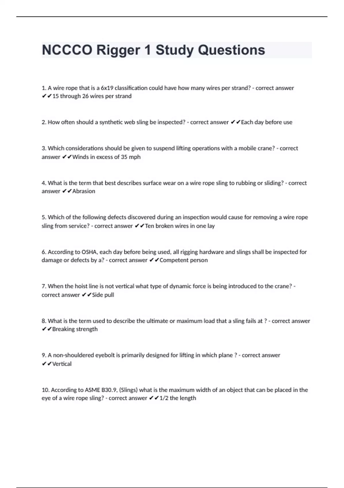 10. According to ASME B30.9, (Slings) what is the maximum width of an object that can be placed in the eye of a wire rope sling? - correct answer ✔✔1/2 the length 11. What is the term used to describe a sudden or unplanned loading of the crane when raising or lowering a load that will increase the stress on rigging and the load? - correct answer ✔✔Shock loading
