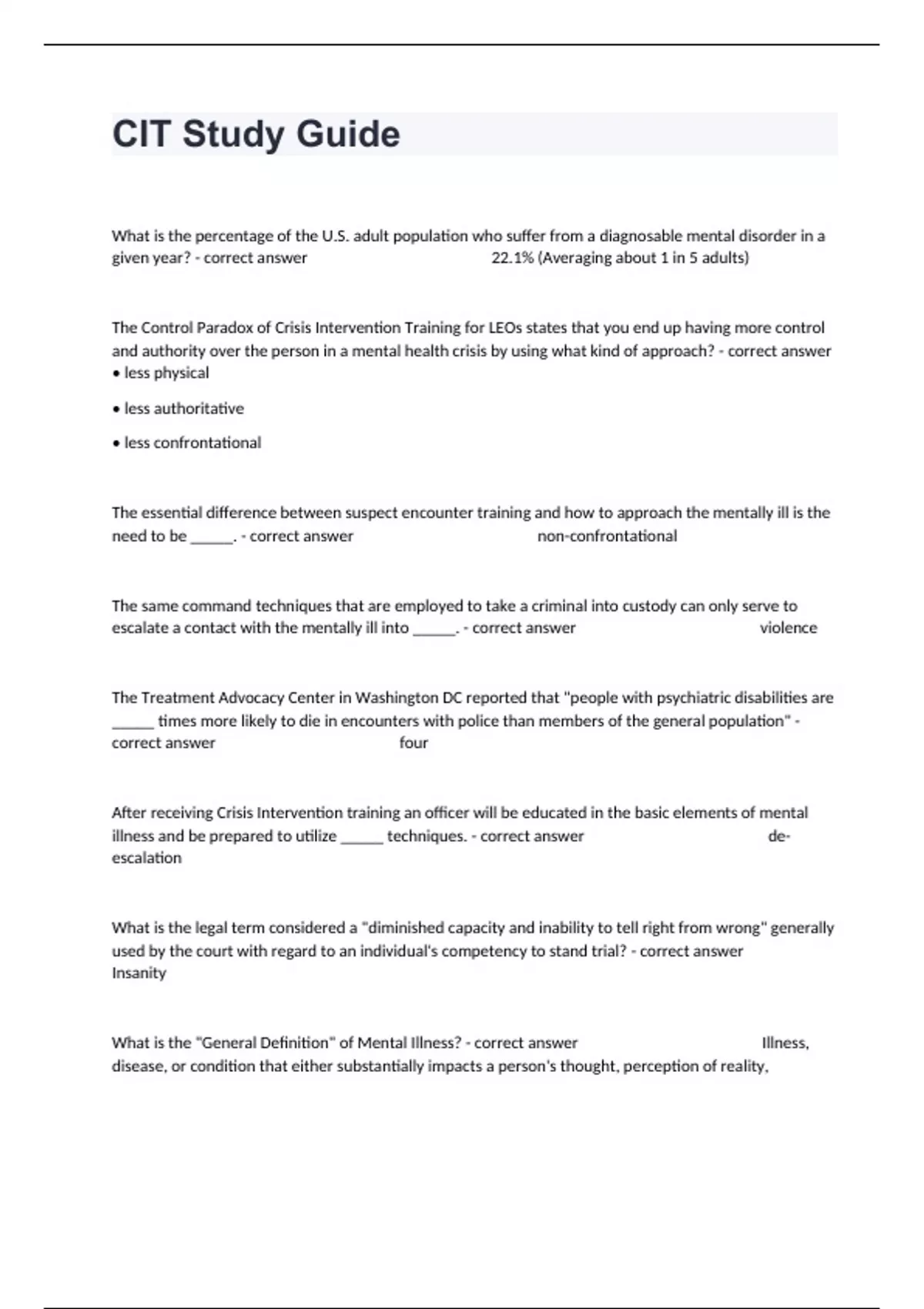 What is the percentage of the U.S. adult population who suffer from a diagnosable mental disorder in a given year? - correct answer 22.1% (Averaging about 1 in 5 adults) The Control Paradox of Crisis Intervention Training for LEOs states that you end up having more control and authority over the person in a mental health crisis by using what kind of approach? - correct answer • less physical • less authoritative • less confrontational The essential difference between suspect encounter training and how to approach the mentally ill is the need to be _____. - correct answer non-confrontational The same command techniques that are employed to take a criminal into custody can only serve to escalate a contact with the mentally ill into _____. - correct answer violence The Treatment Advocacy Center in Washington DC reported that "people with psychiatric disabilities are _____ times more likely to die in encounters with police than members of the general population" - correct answer four After receiving Crisis Intervention training an officer will be educated in the basic elements of mental illness and be prepared to utilize _____ techniques. - correct answer de-escalation What is the legal term considered a "diminished capacity and inability to tell right from wrong" generally used by the court with regard to an individual's competency to stand trial? - correct answer Insanity What is the "General Definition" of Mental Illness? - correct answer Illness, disease, or condition that either substantially impacts a person's thought, perception of reality, emotional process, or judgment, or grossly impairs a person's behavior, as manifested by recent disturbance behavior. What are the four prominent categories of mental illness listed in your BPOC - correct answer • Personality Disorders • Mood Disorders • Psychosis • Developmental Disorders Match each of the descriptions to one of the three most common - correct answer Personality Disorders Encountered by Law Enforcement. Paranoid - correct answer Foresee being in position to be used or harmed by others Perceive dismissiveness from other people Antisocial - correct answer Most commonly recognized in males These individuals know that what they are doing is wrong, but do it anyway Borderline - correct answer Most commonly recognized in females recurrent suicidal threats feelings of abandonment A mood disorder is another type of mental illness demonstrated by disturbances in one's _____. - correct answer emotional reactions and feelings What are the two most common Mood Disorders encountered by law enforcement? - correct answer • DEPRESSION • BIPOLAR DISORDER The following are all symptoms associated with Depression - correct answer o Loss of interest o Prolonged feelings of hopelessness or excessive guilt o Loss of interest in usual activities o Difficulty concentrating or making decisions o Low energy/fatigue o Changes in activity level o An inability to enjoy usual activities o Changes in eating habits leading to weight gain or loss o Changes in sleeping habits The single most common factor in suicidal behavior or death by suicide is that the individual is experiencing _____. - correct answer Depression. A mental illness involving mania and depression. - correct answer BIPOLAR DISORDER an illness involving a distortion of reality that may be accompanied by delusions and/or hallucinations. - correct answer Psychosis False beliefs not based on factual information. - correct answer Delusion Distortions in the senses, causing the individual to experience hearing or seeing something that is not there. - correct answer Hallucinations The following are common delusions experienced by persons during a psychotic episode. - correct answer • Hearing voices • Feelings of paranoia • Visual hallucinations • Heightening of the senses List the behavioral cues of persons with a psychosis - correct answer • Inappropriate or bizarre dress • Body movements are lethargic or sluggish • Impulsive or repetitious body movements • Responding to hallucinations • Causing injury to self • Home environment (eg. aluminum on windows) • Unusual attachment to childish objects or toys What does the following list describe? • Lack of emotional response • Extreme or inappropriate sadness • Inappropriate emotional reactions - correct answer Emotional cues of persons with a psychosis Substance Abuse Disorder: Prolonged abuse of any drug (alcohol, prescription medications or "street" drugs) will cause chemical dependency or addiction. This has an effect on consciousness, and if used long enough or in large dosages, may cause damage to the _____ _____ _____.This may cause a wide range of psychological reactions that can be classified as disorders - correct answer central nervous system Schizophrenia consists of a group of psychotic disorders characterized by changes in perception. These disorders cause oversensitivity to sounds and visions characterized by and/or_____ _____ _____. It is considered the most chronic and disabling of severe mental illnesses, typically emerging in teenagers and young people. - correct answer impaired distorted thinking Name one thing that distorted thinking can result in? - correct answer o Hallucinations o Poor processing of information / attention deficit o Illogical thinking that can result in disorganized and rambling speech, and/or delusions A person experiencing Alzheimer's disease may get lost easily, have poor memory and become easily _____. - correct answer agitated How many Americans are estimated to be afflicted with Alzheimer's disease according to your BPOC? - correct answer 2-3 million Americans What are the two most common developmental disorders that relate to officer contact? - correct answer • AUTISM • MENTAL RETARDATION; IDD(Intellectual and Developmental Disability) Autism- A developmental disorder, usually appearing before age 3. characterized by - correct answer • impaired non-verbal com