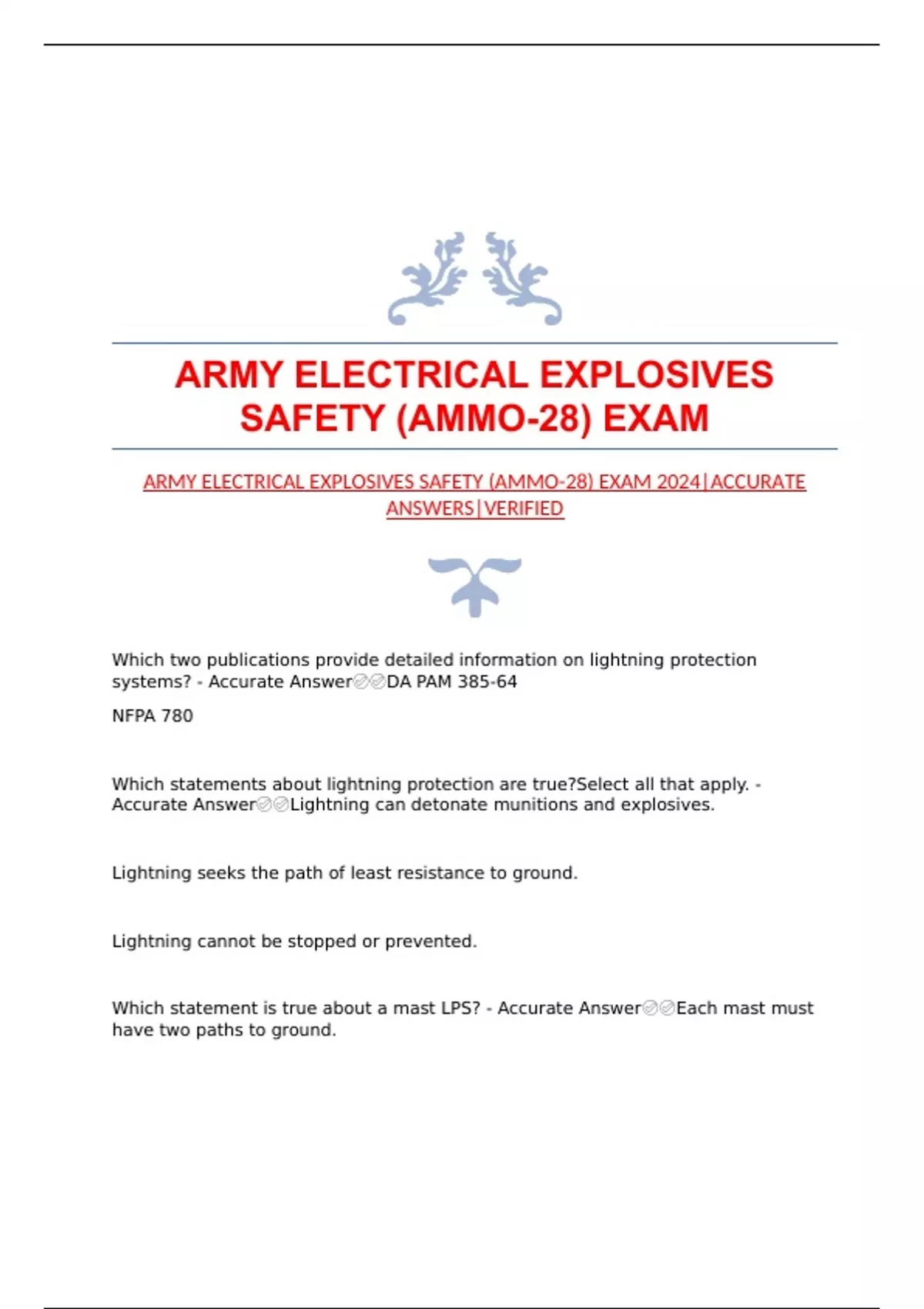 ARMY ELECTRICAL EXPLOSIVES SAFETY (AMMO-28) EXAM ARMY ELECTRICAL EXPLOSIVES SAFETY (AMMO-28) EXAM 2024|ACCURATE ANSWERS|VERIFIED Which two publications provide detailed information on lightning protection systems? - Accurate AnswerDA PAM 385-64 NFPA 780 Which statements about lightning protection are true?Select all that apply. - Accurate AnswerLightning can detonate munitions and explosives. Lightning seeks the path of least resistance to ground. Lightning cannot be stopped or prevented. Which statement is true about a mast LPS? - Accurate AnswerEach mast must have two paths to ground. A 30-foot tall building is protected by a catenary system. How far from the building should the masts be placed? - Accurate Answerat least 6 feet Which LPS uses air terminals and conductors mounted directly to the structure? - Accurate AnswerIntegral Why does the wooden mast have an air terminal on top and two down conductors running its entire length? - Accurate AnswerThe wooden mast is not electrically conductive Which of the following is NOT a requirement for air terminals? - Accurate AnswerAir Terminals must be at least 6 f