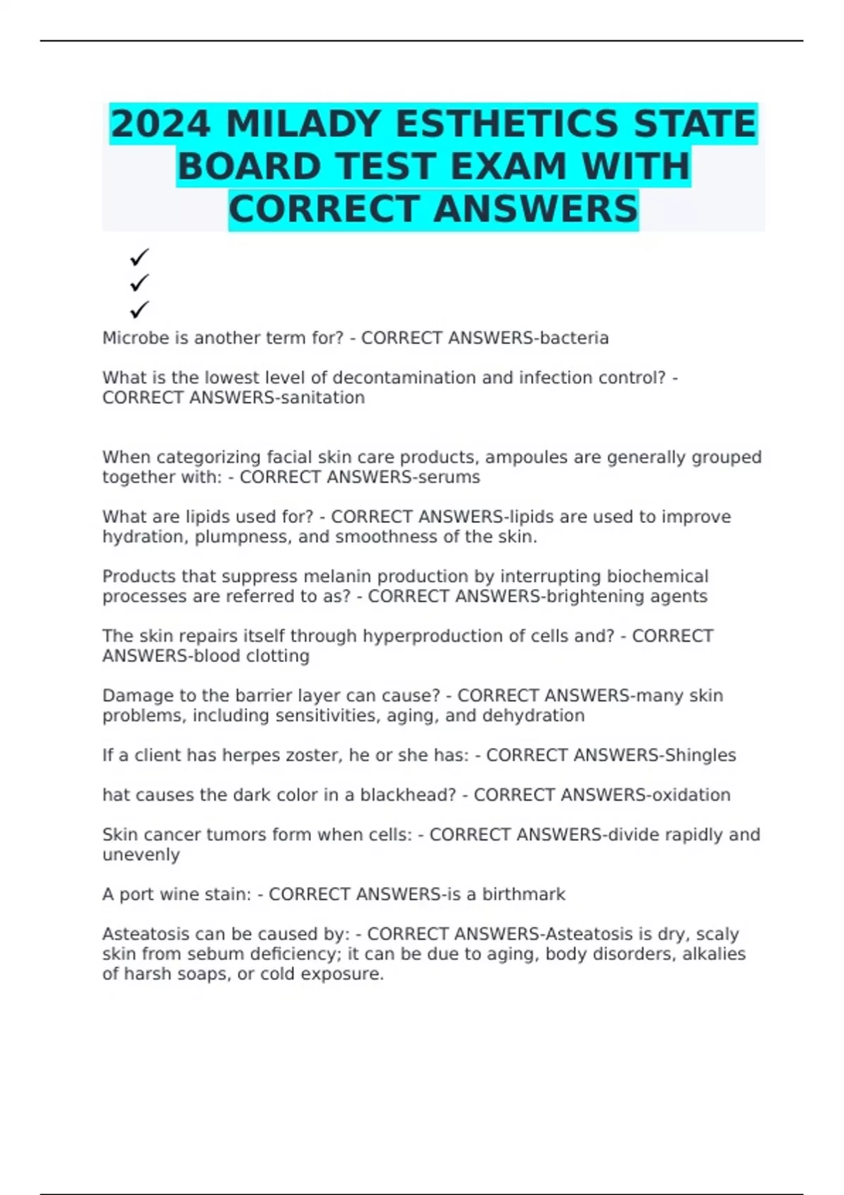 2024 MILADY ESTHETICS STATE BOARD TEST EXAM WITH CORRECT ANSWERS