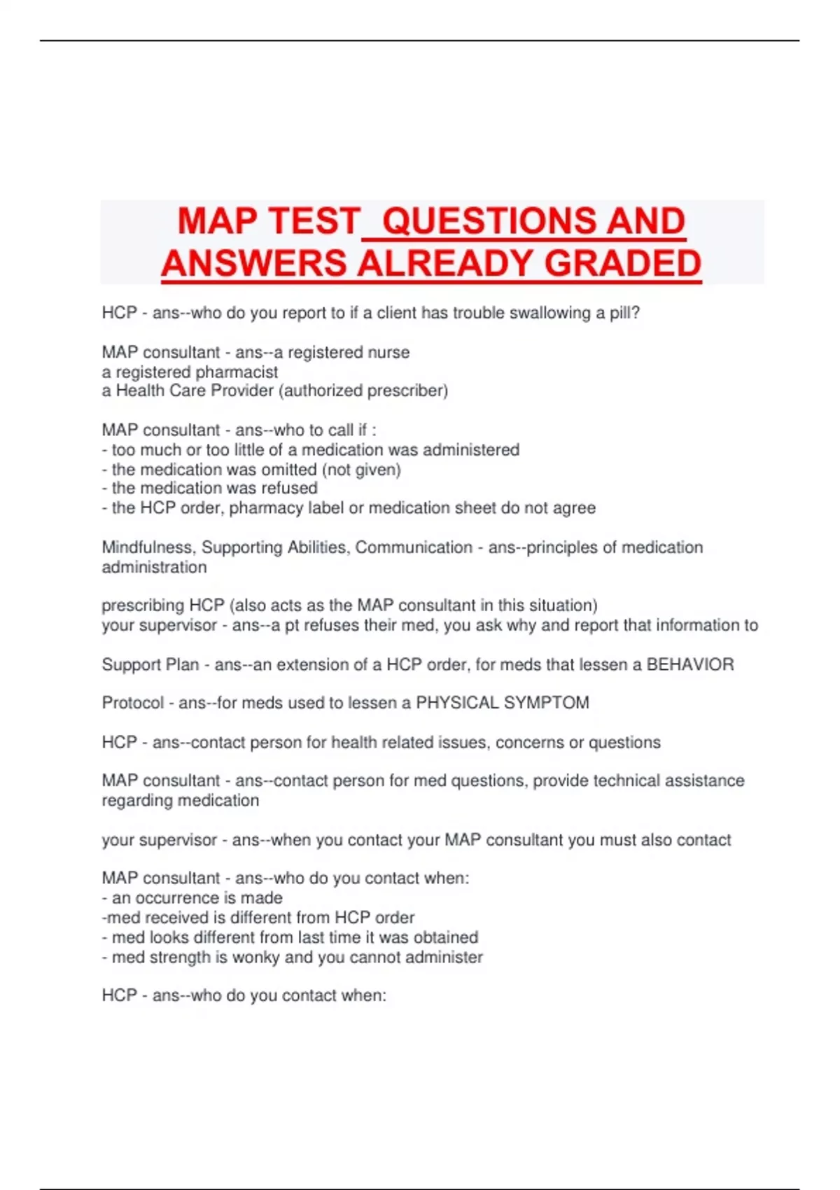 MAP KNOWLEDGE TEST QUESTIONS AND CORRECT ANSWERS A GRADED what are the three principles of medication administration? - ansmindfulness, supporting abilities, communication who may act as a MAP consultant? - ansa registered nurse, registered pharmacist, and an HCP who is an authorized prescriber what is the first thing you should do if a person refuses to take their medication? - ansask them why they do not want to take it, then report that to the HCP and your supervisor How do you correct a documentation error? - ansdraw a single line through the error, write "error," and write your initials and document what you meant to write the first time what are some examples of an identifier for a countable controlled medication? - ansC stamped, Rx number starting with a C or N, or color coded packaging What type of supplement does not fall under MAP? - ansnutritional supplements What type of supplement does fall under MAP? - ansdietary supplements What factors may influence how someone responds to a medication? - ansage, weight, gender, general health, medical history, level of physical activity, and use of other medications How do you prepare someone for an HCP appointment? - anstell them date and time, what will happen, follow any ordered instructions what should you make sure to bring to an HCP appointment? - ansperson's insurance card, copy of medication list, HCP encounter/consult/order form what should you do during an HCP appointment with a patient? - ansassist of needd and advocate, encourage participation, and support abilities what do you do with information for an HCP telephone order? - ansdocument order word-for-word on telephone order form, read it back, transcribe the order, and provide pharmacy contact info what does exhausting a current supply of medicaiton mean? - ansif there is a change to dose or frequency of medication, it is acceptable to use up the current supply of medication until new prescription is filled, as long as that is approved by the pharmacist what are the ways in which an HCP can provide a prescription to a pharmacy? - anselectronic, telephone, paper what should you do if a medication is different in color, shape, size, or markings from the last time it was filled? - anscontact MAP consultant before administering what should you do if the pharmacy will not allow the correct dose to be administered? - ansreturn the medication to the pharmacy and obtain the correct strength when should you request a medication refill? - answhen there is no less than a seven-day supply of medication remaining what should you do when the last refill of a medication is obtained? - anscontact the HCP and request a new prescription how must countable medication be stored? - ansdouble key locked in tamper resistant packaging when and why do you complete an accuracy check? - ansprior to the first medication administration of the new month, two staff (ideally together) will check the new months med sheets for accuracy and to ensure all ongoing transcriptions were copied onto the new sheet when are acceptable medication sheet codes used? - answhen a medication is administered at a location other than the home, the person is learning to self-administer their medication, or the person was not present during medication administration time in what scenario does a specific time not need to be written for a medication? - ansif it is a PRN what are the steps for discontinuing a medication? - anscross out all open boxes on the medication sheet, draw a diagonal line through the left side and add DC date and initials, draw a diagonal line through the right side and add DC date and initials what are the steps to complete when an HCP order is received? - anstranscribe order onto med sheet, post (documentation of the staff who completed the transcription), and verify (review of the transcription by a second staff member) why is posting and verifying necessary? - ansto ensure all medication orders are transcribed accurately so that medication is administered as ordered what do you do if an HCP order says "no new orders" or "no medication changes"? - ansstill post and verify the order what do you do if two certified/licensed staff are not available when the medication is due to be administered? - ansfirst staff completes the transcription and posts the HCP order, the next staff on duty must verify the order how to do you receive telephone orders? how are they different than written HCP orders? - ansorders are posted and verified when the order is initially obtained and again after the HCP as signed the order what details must be included in PRN medication order? - ansspecific target signs and symptoms for use, measurable objective criteria if needed, frequency, and parameters for use how do you document administering a PRN? - ansin medication box, write initials and time administered (under correct date) and use a box based on time of administration. additionally, you must write a corresponding medication progress note what are the 5 rights of medication administration? - ansright person, right medication, right dose, right time, right route if you don't know the person you are administering meds to, how should you identify them? - anslook at a current picture or ask staff who is familiar with the person how do you determine medication dose on a pharmacy label? - ansmultiplying the strength by the amount