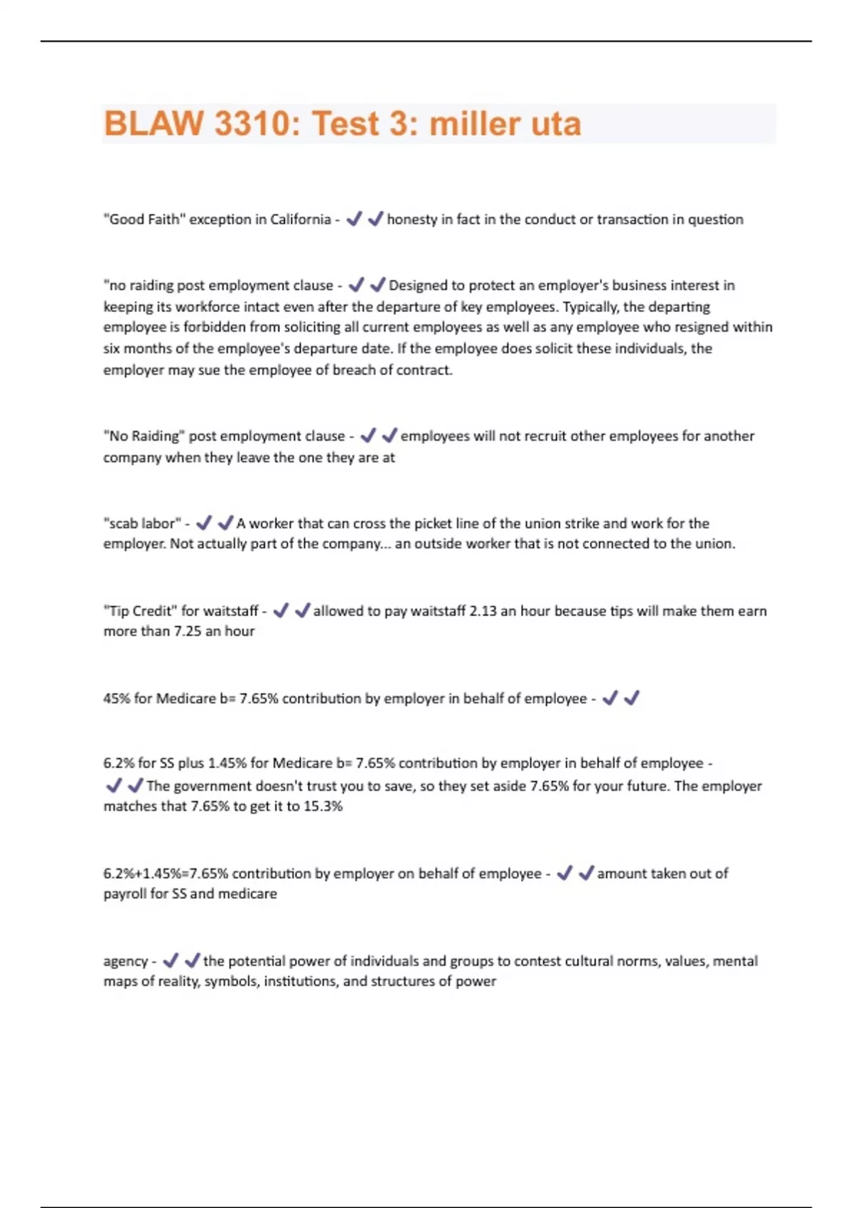 "Good Faith" exception in California - honesty in fact in the conduct or transaction in question "no raiding post employment clause - Designed to protect an employer's business interest in keeping its workforce intact even after the departure of key employees. Typically, the departing employee is forbidden from soliciting all current employees as well as any employee who resigned within six months of the employee's departure date. If the employee does solicit these individuals, the employer may sue the employee of breach of contract. "No Raiding" post employment clause - employees will not recruit other employees for another company when they leave the one they are at "scab labor" - A worker that can cross the picket line of the union strike and work for the employer. Not actually part of the company... an outside worker that is not connected to the union. "Tip Credit" for waitstaff - allowed to pay waitstaff 2.13 an hour because tips will make them earn more than 7.25 an hour 45% for Medicare b= 7.65% contribution by employer in behalf of employee - 6.2% for SS plus 1.45% for Medicare b= 7.65% contribution by employer in behalf of employee - The government doesn't trust you to save, so they set aside 7.65% for your future. The employer matches that 7.65% to get it to 15.3% 6.2%+1.45%=7.65% contribution by employer on behalf of employee - amount taken out of payroll for SS and medicare agency - the potential power of individuals and groups to contest cultural norms, values, mental maps of reality, symbols, institutions, and structures of powerArticle 2 of the UCC - governs the sale of goods articles of incorporation - a written legal document that defines ownership and operating procedures and conditions for the business artisan's lien - type of lien that permits an artisan to retain possession of a piece of work until it has been paid for Assumed name certificate (d/b/a) - Any type of entity structure can file an Assumed Name, whether you are operating as a sole proprietor, a partnership, a corporation, or an LLC. authorization cards - A card signed by an employee at the worksite targeted to possible unionization; the card authorizes the union to request that an election be held to determine if all workers will be represented by the union. bargaining unit agent - The union recognized and certified by the National Labor Relations Board, upon election by majority of the workers, to be the exclusive representative of employees in a bargaining unit (worksite) to determine working conditions and wages. Business Judgment Rule (BJR) - rule that allows management immunity from liability for corporate acts where there is a reasonable indication that the acts were made in good faith with due care Bylaws - A set of governing rules adopted by a corporation or other association. Cashier's check - check guaranteed by a bank, drawn on the bank's own funds and signed by a cashier Certificate of Deposit (CD) - A savings alternative in which money is left on deposit for a stated period of time to earn a specific rate of return. Charter - A document that gives the holder the right to organize settlements in an areacollateral - A security pledged for the repayment of a loan. collective bargaining in good faith - The process by which the employer and the union, on behalf of all employees in a collective bargaining unit, negotiate a contract, setting forth the terms and conditions commerce clause - Commerce Clause - part of the U.S. Constitution that gives Congress the power to regulate interstate commerce; the basis of much federal regulation concerns of franchisee - Shrinking disposable income, Increasing competition, Rising costs,Falling staff morale, Bad debts, Adapting to consumer needs. Concerns of franchisor - quality Contribution by Employee - company sponsored retirement plan where the employee may elect to have a portion of each paycheck deposited into a retirement account owned by the employee and held in their name contribution by employee - Employee adds a certain percentage each month to set aside in the 401(k) Deficiency Judgment - A personal judgment levied against the borrower when a foreclosure sale does not produce sufficient funds to pay the mortgage debt in full. Defined Benefits Plan - company pension plan where employee's pension payments are calculated according to length of service and the salary they earned at the time of retirement Defined Contributions Plan (401K plans) - retirement plan where the employee, employer, or both make contributions on a regular basisdefined contributions plans (e.g. 401(k) plans - - Retirement plans through corporations. Company will contribute up to a certain percentage of what the employee contributes. disclaimer of warranty - a negation or restriction of the rights under a warranty given by a seller to a buyer double taxation - feature of taxation that allows stockholders' dividends to be taxed both as corporate profit and as personal income Drawee - The bank on which a check is written. drawer - the person who signs a check Duration of Corporation - Can have perpetual existence