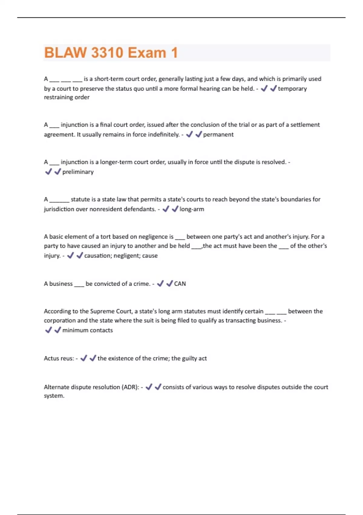 A ___ ___ ___ is a short-term court order, generally lasting just a few days, and which is primarily used by a court to preserve the status quo until a more formal hearing can be held. - temporary restraining order A ___ injunction is a final court order, issued after the conclusion of the trial or as part of a settlement agreement. It usually remains in force indefinitely. - permanent A ___ injunction is a longer-term court order, usually in force until the dispute is resolved. - preliminary A ______ statute is a state law that permits a state's courts to reach beyond the state's boundaries for jurisdiction over nonresident defendants. - long-arm A basic element of a tort based on negligence is ___ between one party's act and another's injury. For a party to have caused an injury to another and be held ___,the act must have been the ___ of the other's injury. - causation; negligent; cause A business ___ be convicted of a crime. - CAN According to the Supreme Court, a state's long arm statutes must identify certain ___ ___ between the corporation and the state where the suit is being filed to qualify as transacting business. - minimum contacts Actus reus: - the existence of the crime; the guilty act Alternate dispute resolution (ADR): - consists of various ways to resolve disputes outside the court system.Although corporate executives cannot be made to testify against themselves, business records that might incriminate the corporation must be ___ since the Fifth Amendment does not ___ such records. - produced; protect An ___ is a court order directing a person to do or not do something. - injunction Appellate courts ensure that the trial court judge ___ applied the law. - correctly Arbitration: - is a process similar to litigation in which two or more persons agree to allow a neutral person or panel to resolve a dispute. binding; cannot appeal Assault (tort): - is intentional conduct directed at a person that places the person in fear of immediate bodily harm or offensive contact. Battery (tort): - is an unlawful touching, which is intentional physical contact without consent. Because the courts encourage negotiation, settlement offers presented in negotiation ___ ___ be used as evidence in court. - may not Benefits of the law: - provides some predictability and uniformity to the boundaries of acceptable conduct in a society Both systems may have jurisdiction when either of the following is the case: - 1. There is diversity of citizenship and the amount in controversy exceeds $75,000. 2. The dispute involves a federal question and Congress has not conferred exclusive jurisdiction on the federal courts. Commonwealth v. Angelo Todesca Corporation: - The Commonwealth (state) of Massachussetts won. The court concluded that one of Todesca corporation's agents, Mr. Gauthier, acting on behalf of the corporation and under its instructions, had committed a crime with the intent of benefiting thecorporation, therefore all the necessary elements to show that the Todesca corporation possessed the proper level of criminal intent, in this case, criminal negligence, are present. Comparative negligence: - the court, in evaluating the actions, should compare the possible negligence of both parties and allocate the liability. Example: If a plaintiff contributes 25% of the fault in a tort, then the defendant would be liable for 75% of the damages found to arise. Compensatory damages: - money damages to compensate for losses incurred because of actions of wrongdoer Congress can regulate ___ ___ form of commerce, even if the impact on interstate commerce is tiny. - almost any Criminal negligence: - criminal conduct that is not intentional, but occurred because one failed to act with the reasonable care that is expected under the circumstances