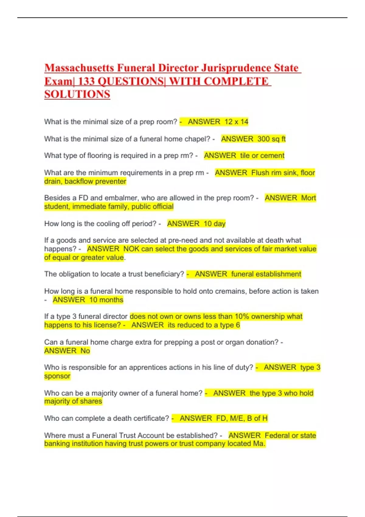 Massachusetts Funeral Director Jurisprudence State Exam| 133 QUESTIONS| WITH COMPLETE SOLUTIONS