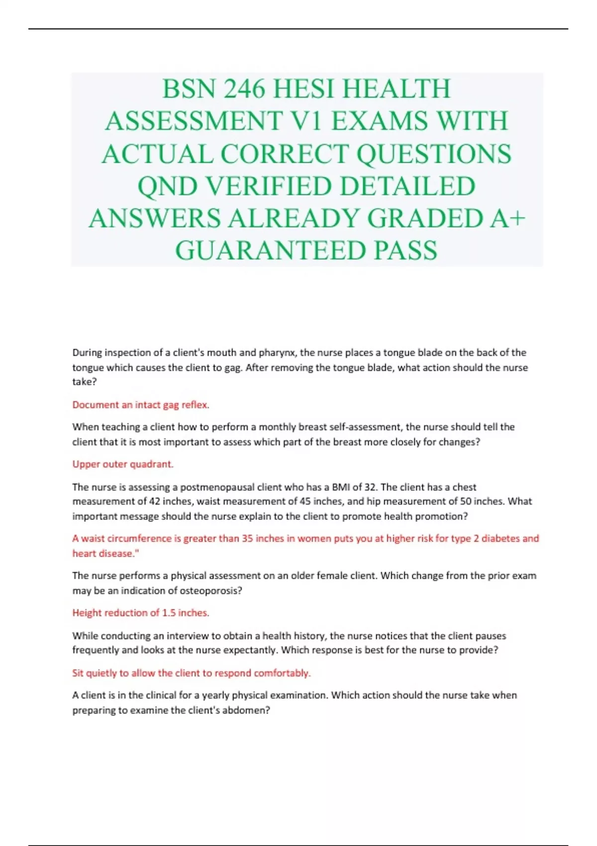 BSN 246 HESI HEALTH ASSESSMENT V1 EXAMS WITH ACTUAL CORRECT QUESTIONS QND VERIFIED DETAILED ANSWERS ALREADY GRADED A+ GUARANTEED PASS