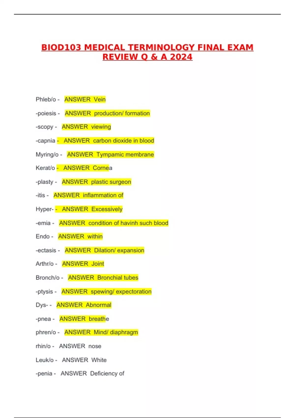 BIOD103 MEDICAL TERMINOLOGY FINAL EXAM REVIEW 2