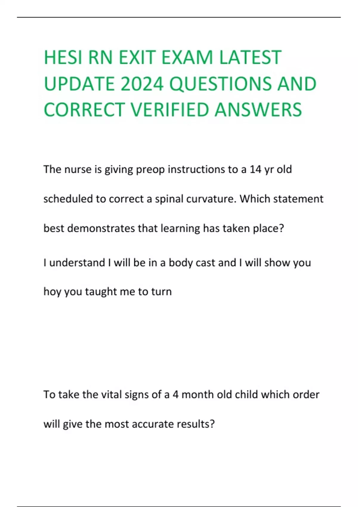 HESI RN EXIT EXAM LATEST UPDATE 2024 QUESTIONS AND CORRECT VERIFIED ANSWERS
