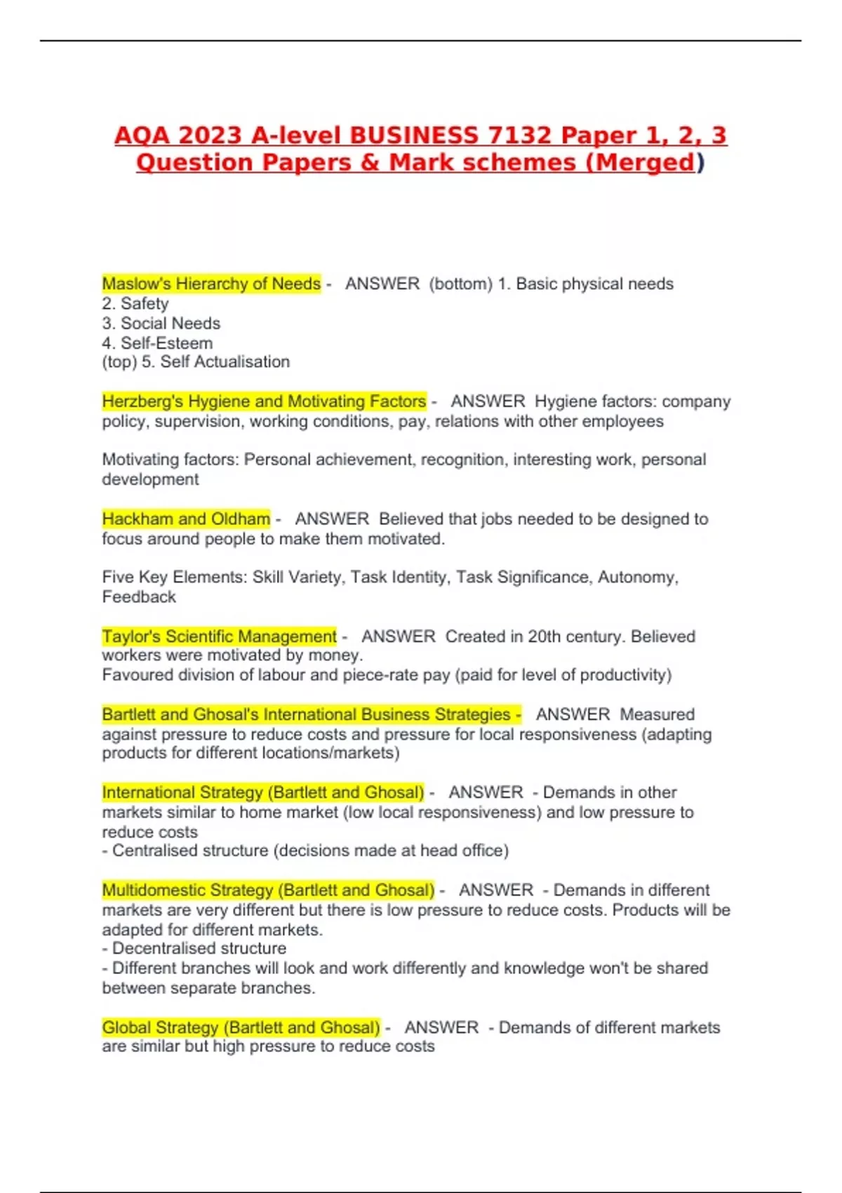 AQA 2023 A-level BUSINESS 7132 Paper 1, 2, 3 Question Papers & Mark schemes (Merged