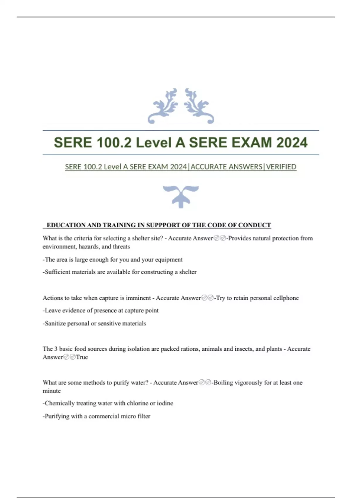 SERE 100.2 Level A SERE EXAM 2024 SERE 100.2 Level A SERE EXAM 2024|ACCURATE ANSWERS|VERIFIED EDUCATION AND TRAINING IN SUPPPORT OF THE CODE OF CONDUCT What is the criteria for selecting a shelter site? - Accurate Answer-Provides natural protection from environment, hazards, and threats -The area is large enough for you and your equipment -Sufficient materials are available for constructing a shelter Actions to take when capture is imminent - Accurate Answer-Try to retain personal cellphone -Leave evidence of presence at capture point -Sanitize personal or sensitive materials The 3 basic food sources during isolation are packed rations, animals and insects, and plants - Accurate AnswerTrue What are some methods to purify water? - Accurate Answer-Boiling vigorously for at least one minute -Chemically treating water with chlorine or iodine -Purifying with a commercial micro filter