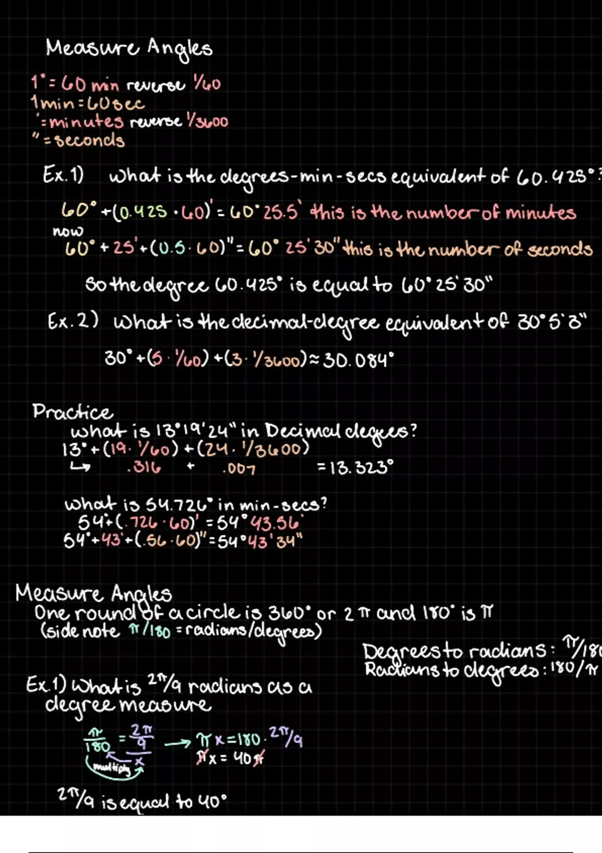 These notes do a brief explanation of how to measure angles in a time format. They are more heavy on the example side more than in depth explanations but the notes are color coded to be followed along and limits confusion. I enjoy making my notes affordable hence the low cost. I believe us students should not have to pay large sums to get the education we need to be successful.