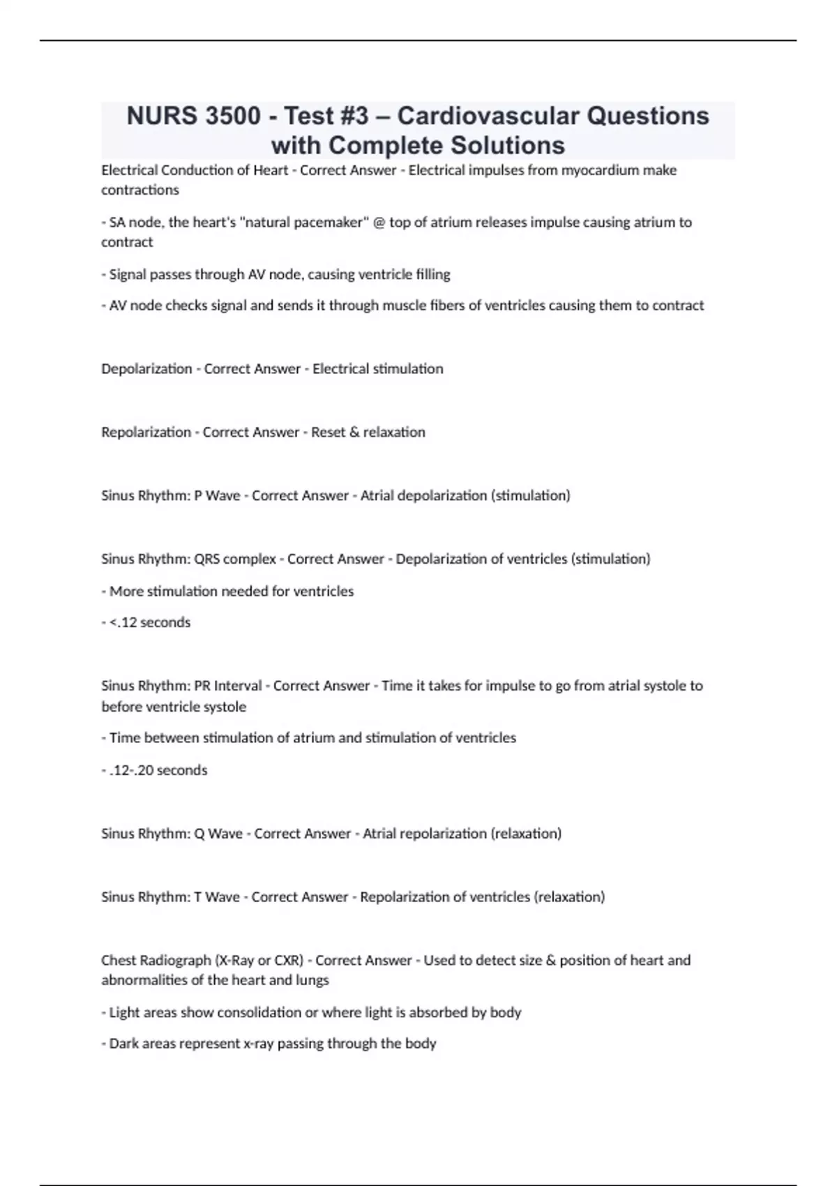 NURS 3500 - Test #3 – Cardiovascular Questions with Complete Solutions Electrical Conduction of Heart - Correct Answer - Electrical impulses from myocardium make contractions - SA node, the heart's "natural pacemaker" @ top of atrium releases impulse causing atrium to contract - Signal passes through AV node, causing ventricle filling - AV node checks signal and sends it through muscle fibers of ventricles causing them to contract Depolarization - Correct Answer - Electrical stimulation Repolarization - Correct Answer - Reset & relaxation Sinus Rhythm: P Wave - Correct Answer - Atrial depolarization (stimulation) Sinus Rhythm: QRS complex - Correct Answer - Depolarization of ventricles (stimulation) - More stimulation needed for ventricles - <.12 seconds Sinus Rhythm: PR Interval - Correct Answer - Time it takes for impulse to go from atrial systole to before ventricle systole - Time between stimulation of atrium and stimulation of ventricles - .12-.20 seconds Sinus Rhythm: Q Wave - Correct Answer - Atrial repolarization (relaxation) Sinus Rhythm: T Wave - Correct Answer - Repolarization of ventricles (relaxation) Chest Radiograph (X-Ray or CXR) - Correct Answer - Used to detect size & position of heart and abnormalities of the heart and lungs - Light areas show consolidation or where light is absorbed by body - Dark areas represent x-ray passing through the body Electrocardiogram (ECG or EKG) - Correct Answer - Records electrical signals as they travel through the heart - Used to look for patterns among heartbeats and rhythms and to diagnose various heart conditions - Can detect: arrhythmias, blocked or narrow coronary arteries, structural problems in heart chambers, previous heart attack Echocardiogram - Correct Answer - Uses sound waves to produce images of heart beating and pumping blood - Images can be used to identify heart di