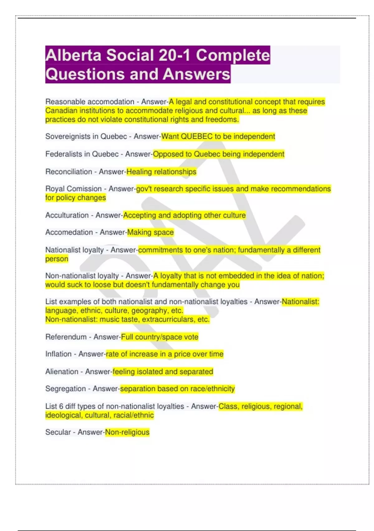 Alberta Social 20-1 Complete Questions and Answers Reasonable accomodation - Answer-A legal and constitutional concept that requires Canadian institutions to accommodate religious and cultural... as long as these practices do not violate constitutional rights and freedoms. Sovereignists in Quebec - Answer-Want QUEBEC to be independent Federalists in Quebec - Answer-Opposed to Quebec being independent Reconciliation - Answer-Healing relationships Royal Comission - Answer-gov't research specific issues and make recommendations for policy changes Acculturation - Answer-Accepting and adopting other culture Accomedation - Answer-Making space Nationalist loyalty - Answer-commitments to one's nation; fundamentally a different person Non-nationalist loyalty - Answer-A loyalty that is not embedded in the idea of nation; would suck to loose but doesn't fundamentally change you List examples of both nationalist and non-nationalist loyalties - Answer-Nationalist: language, ethnic, culture, geography, etc. Non-nationalist: music taste, extracurriculars, etc. Referendum - Answer-Full country/space vote Inflation - Answer-rate of increase in a price over time Alienation - Answer-feeling isolated and separated Segregation - Answer-separation based on race/ethnicity List 6 diff types of non-nationalist loyalties - Answer-Class, religious, regional, ideological, cultural, racial/ethnic Secular - Answer-Non-religious