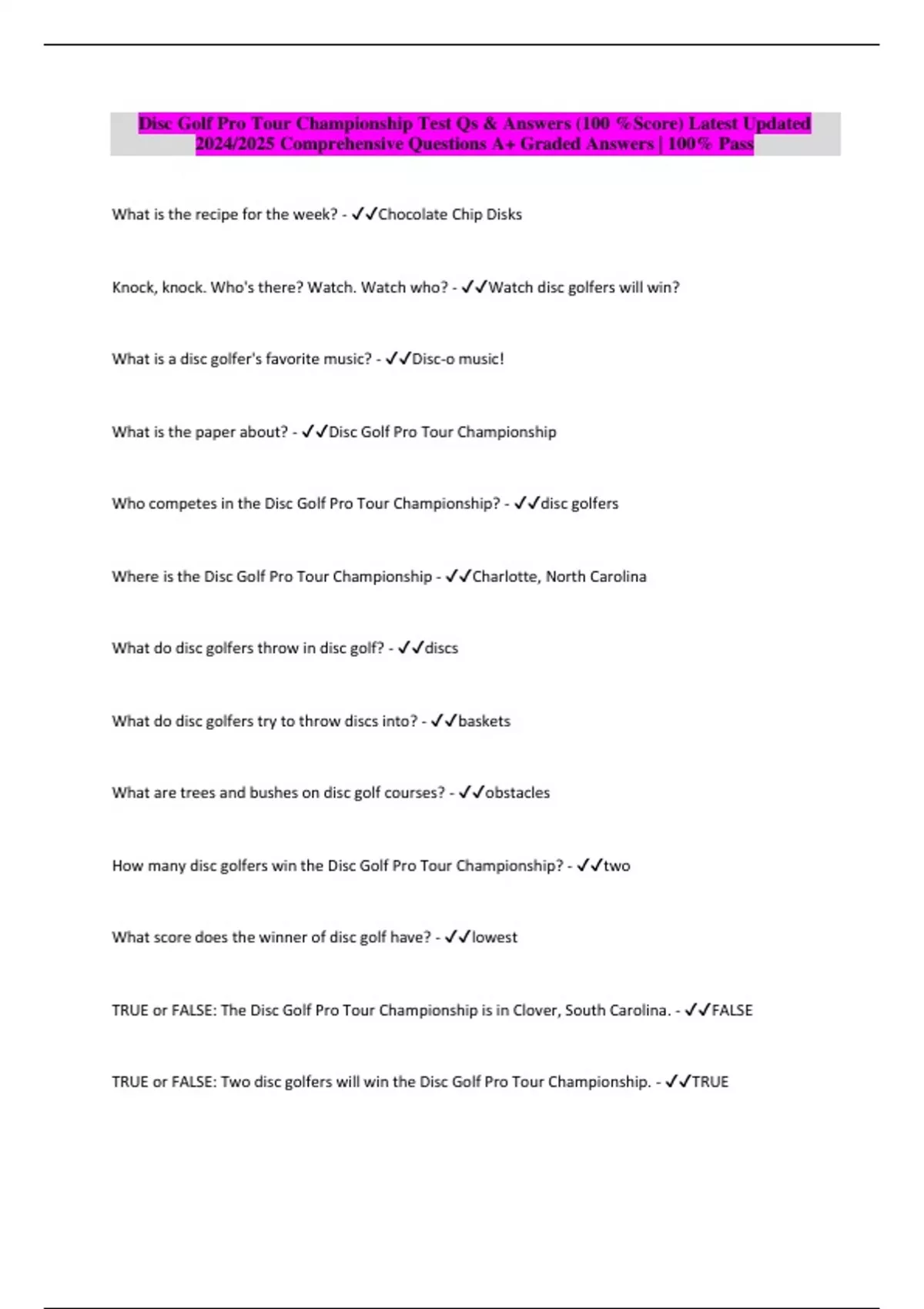 Disc Golf Pro Tour Championship Test Qs & Answers (100 %Score) Latest Updated 2024/2025 Comprehensive Questions A+ Graded Answers | 100% Pass