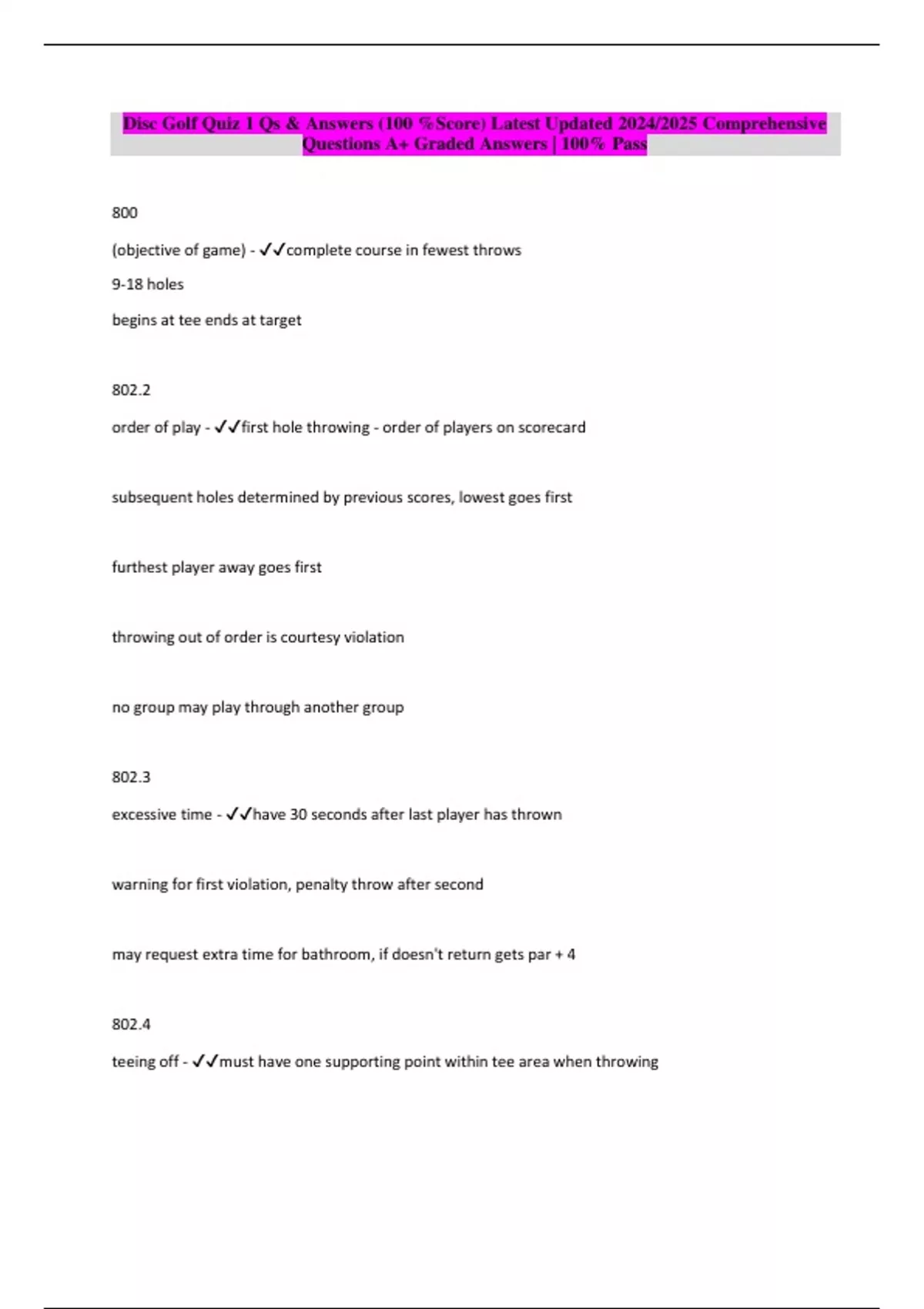 Disc Golf Quiz 1 Qs & Answers (100 %Score) Latest Updated 2024/2025 Comprehensive Questions A+ Graded Answers | 100% Pass