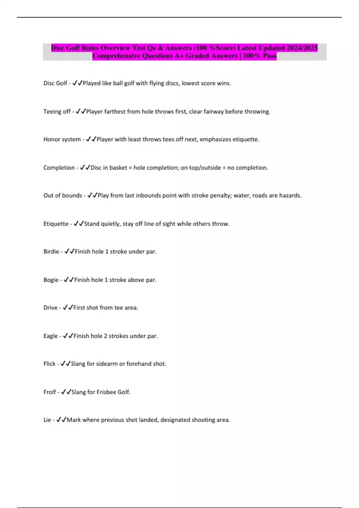 Disc Golf Rules Overview Test Qs & Answers (100 %Score) Latest Updated 2024/2025 Comprehensive Questions A+ Graded Answers | 100% Pass