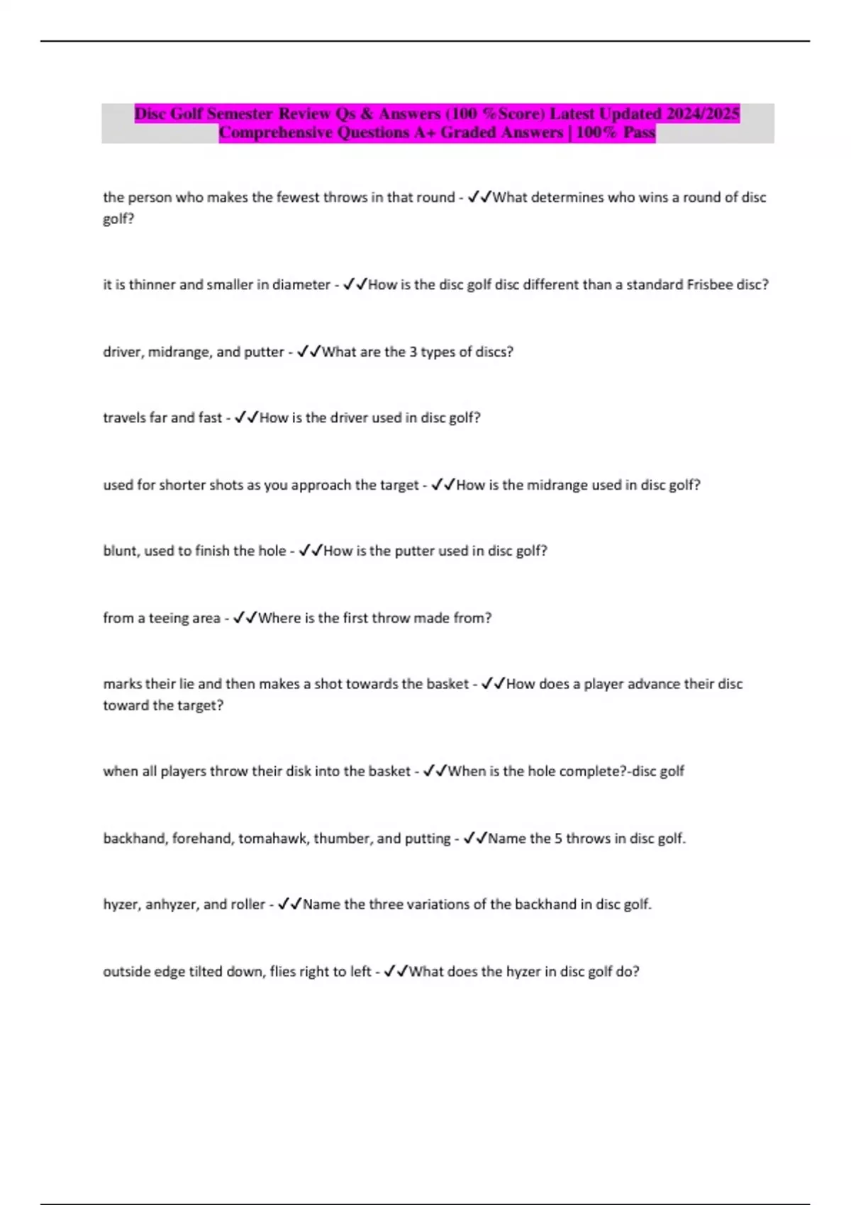 Disc Golf Semester Review Qs & Answers (100 %Score) Latest Updated 2024/2025 Comprehensive Questions A+ Graded Answers | 100% Pass